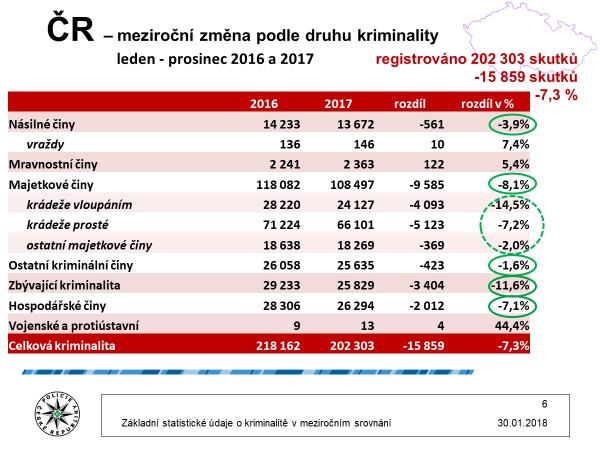 Přestože kriminalita oproti loňskému roku mírně klesla, jsou některá čísla stále alarmující. Za rok 2017 Policie ČR eviduje na 202 303 kriminálních případů se škodami způsobenými pachateli trestných činů, které dosahují 20,3 miliard korun. Objasněnost kriminálních případů je pak nejnižší v Praze (méně než 25 %), dále v Jihočeském, Středočeském a Plzeňském kraji (méně než 50 %).