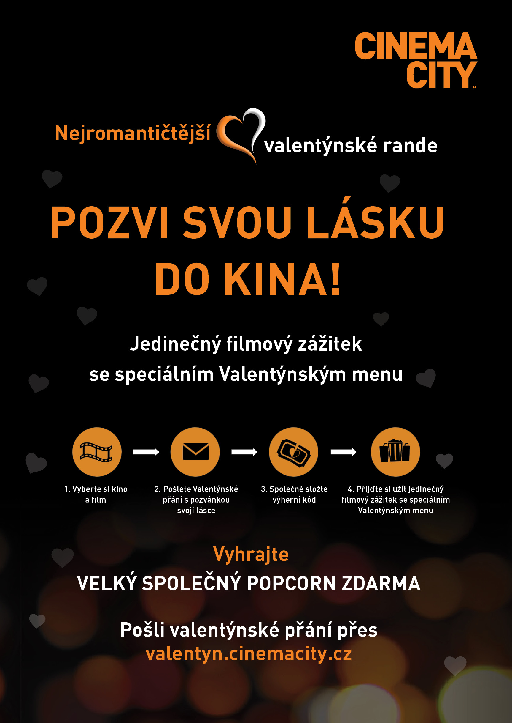 Pozvěte svou lásku na romantické rande do kina a užijte si jedinečný filmový zážitek se speciálním Valentýnském menu! Zařídit rande na míru, vymyslet pro svou lásku něco originálního nebo překonat obavy z pozvání na první rande – to vše teď můžete hodit za hlavu, protože nová valentýnská aplikace Cinema City je tady! Použít aplikaci zvládne každý, stačí jen pár kliknutí a rande je na světě Na adrese: valentyn.cinemacity.cz se můžete zaregistrovat nebo se přihlásit přes Facebook. Pak už jen stačí vybrat kino a film, na který chcete svoji lásku pozvat. V dalším kroku si vyberete valentýnské přáníčko a text, který má být v pozvánce uveden. Pak už jen stačí pozvánku odeslat buď zprávou na Facebooku nebo prostřednictvím emailu. Po kliknutí na „odeslat“ se pak odsoudíte k napínavému čekání, zdali vaše drahá polovička přijme vaše pozvání. Pokud se vše povede a vaše vyvolená/vyvolený pozvání přijme, dostane každý z vás jednu polovinu výherního kódu. Při setkání v kině pak svůj kód složíte dohromady a získáte za něj při koupi dvou středních nápojů jeden velký společný popcorn zdarma. Takže neváhejte