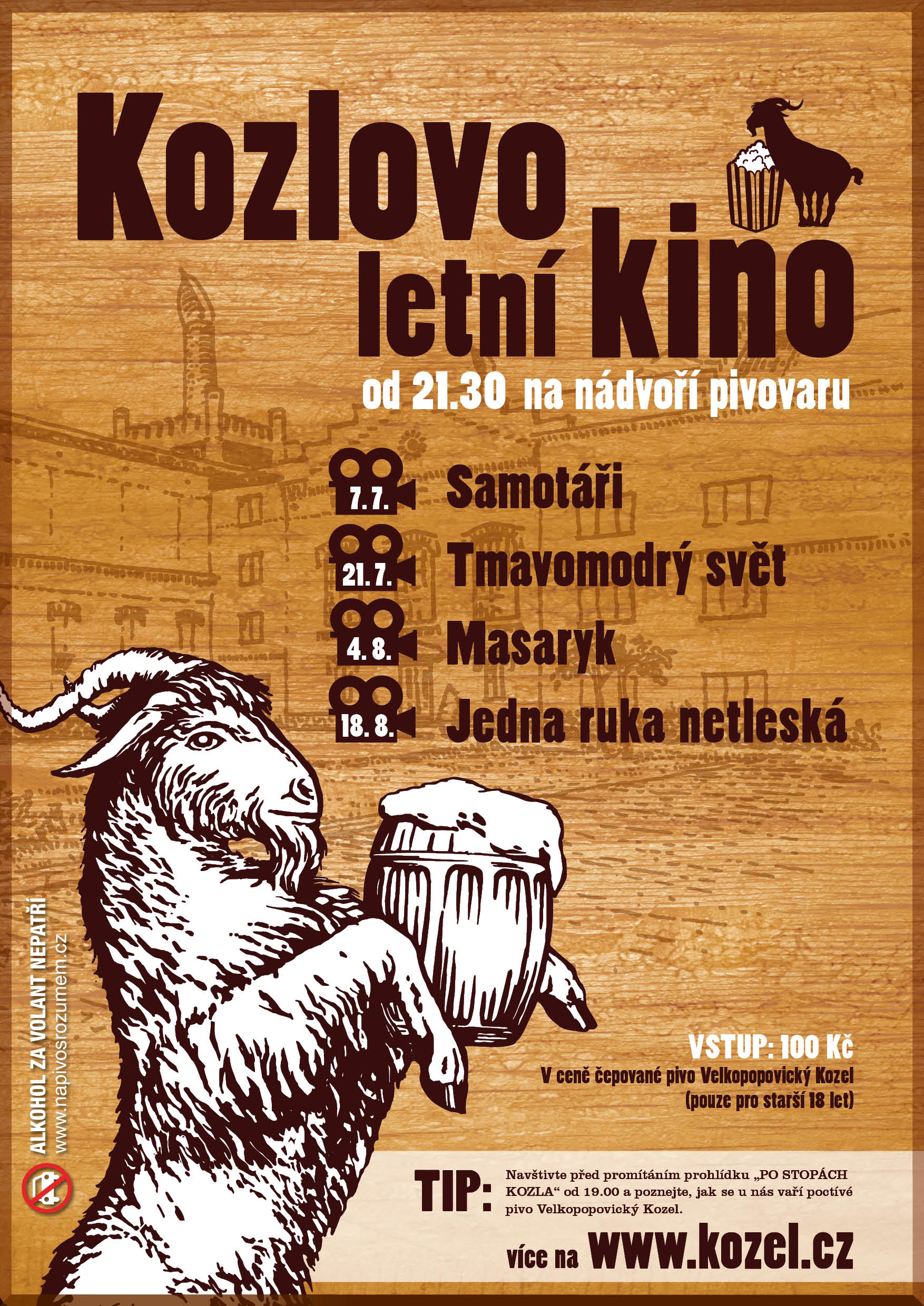 Program Kozlova letního kina zahájí 7. července Samotáři, kultovní tragikomedie o životě současné mládeže, o jejich trápení, láskách, štěstí a nenaplněných snech. Osudy českých stíhačů ve službách RAF za 2. světové války v dramatu Tmavomodrý svět budou na velkém plátně na nádvoří velkopopovického pivovaru k vidění 21. července. První srpnový sobotní večer (4. 8.) bude patřit 12 Českými lvy ověnčenému filmu Masaryk a 18. srpna Jiří Macháček a Ivan Trojan bravurně rozehrají své herecké party v černé komedii o věčném smolaři Jedna ruka netleská.