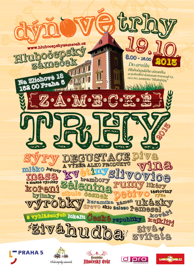 Přijďte načerpat inspiraci na Dýňové zámecké trhy! Farmáři z celé republiky budou útočit na vaše chuťové buňky už 19. října 2013 v areálu Hlubočepského zámečku v Praze. Těšit se můžete nejen na dýně, ale doslova na všechny chutě, na které si jen vzpomenete. Voňavé sýry, šťavnatá masíčka, kouzelné koření, všechny dobroty které máte rádi. Kromě jídla můžete degustovat piva, vína, slivovice a další alkoholické nápoje co hrdlo ráčí. Zabaví vás ukázky klasických řemesel, v místní selské krčmě si můžete zaskotačit na živou kapelu Jo & Susanne, vaše děti se mohou na vesnické poznávací cestičce seznámit s živými zvířaty a klasickými řemesly nebo se zabavit v dětském koutku. V Hlubočepském zámečku na vás prostě čeká jedinečný farmářský trh plný gurmánských a vizuálních zážitků. V areálu je veškeré zázemí, včetně toalet a sezení až pro 800 lidí. Dostanete se sem pohodlně tramvají 12, 14 nebo 20 ze zastávky Hlubočepy.