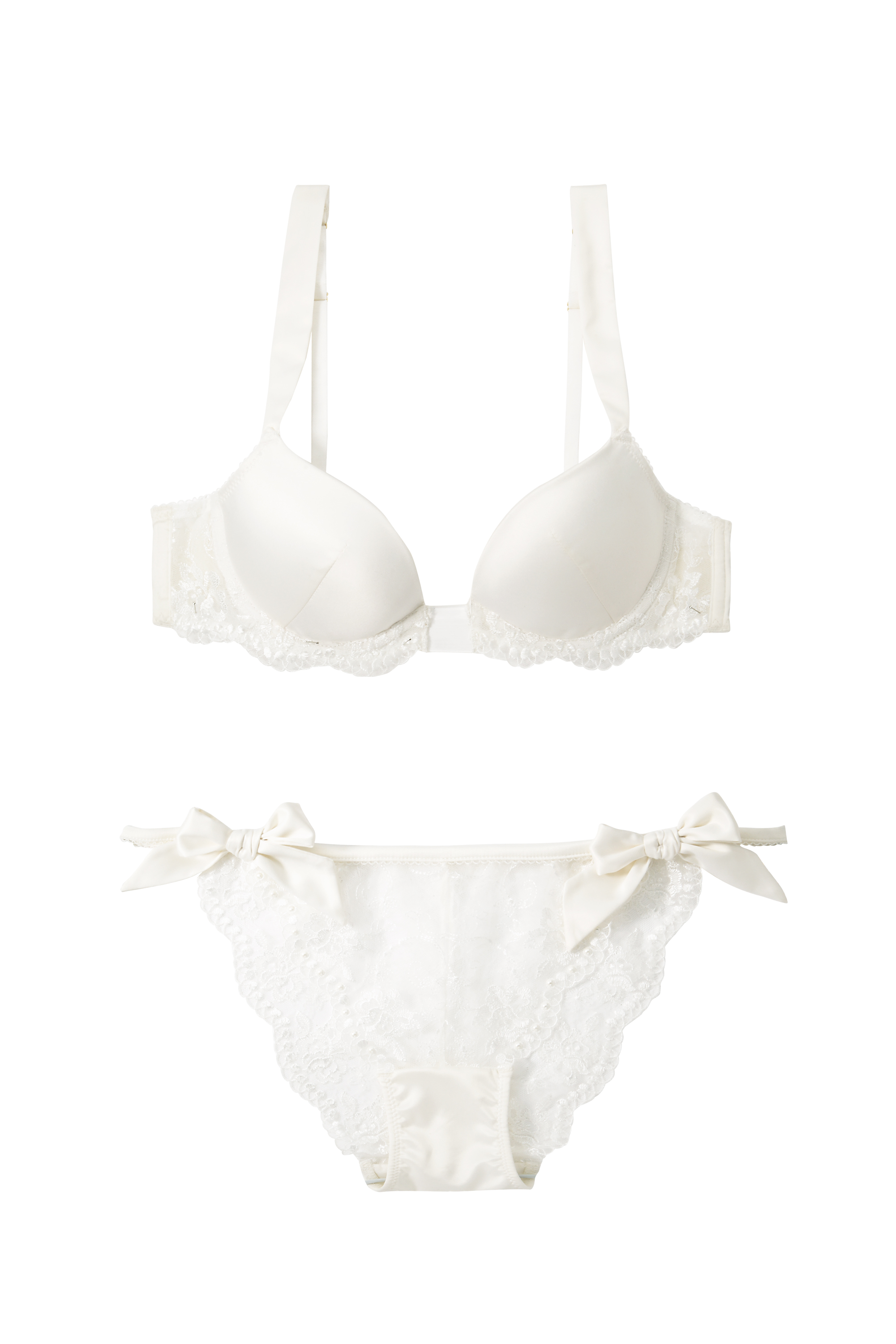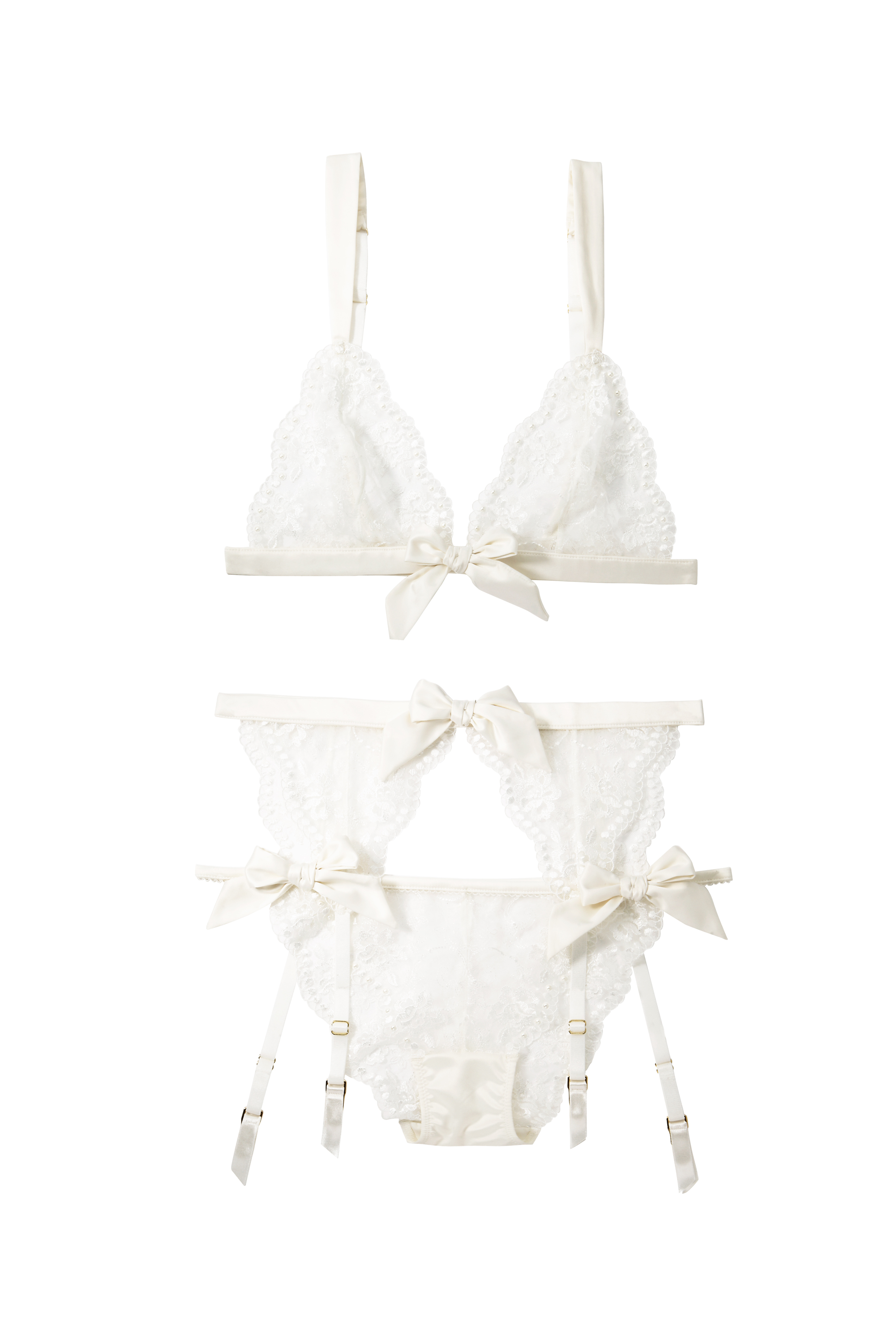 Satén, krajka a mašličky jsou romantické a cudné – právě taková by nevěsta měla být. Doporučená cena za podprsenku: 749 Kč. Doporučená cena za podvazky: 629 Kč. Doporučená cena za kalhotky: 429 Kč.