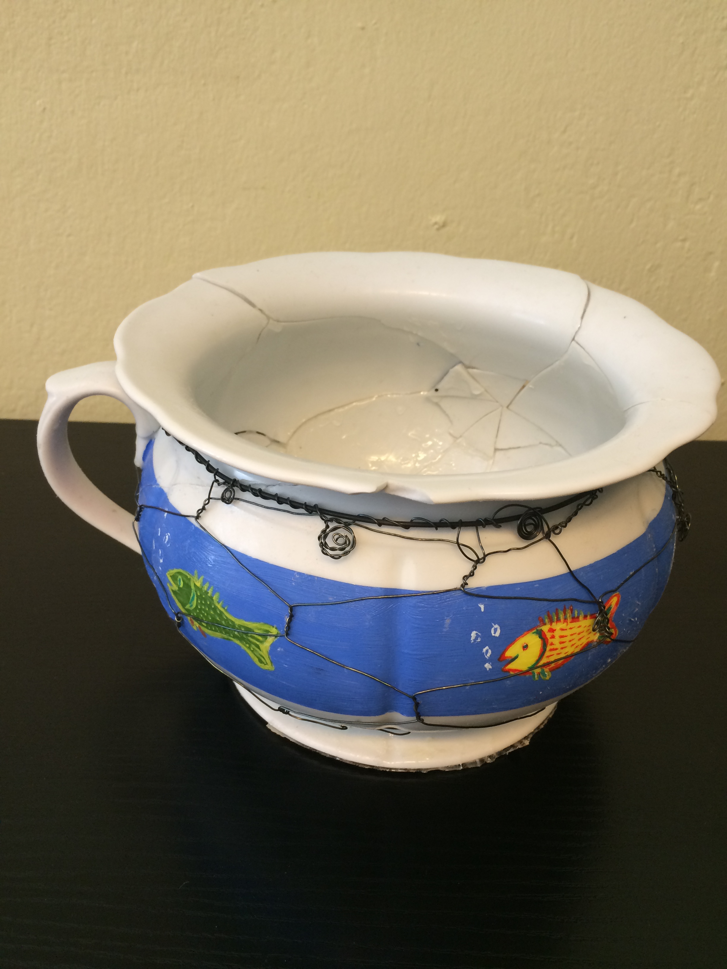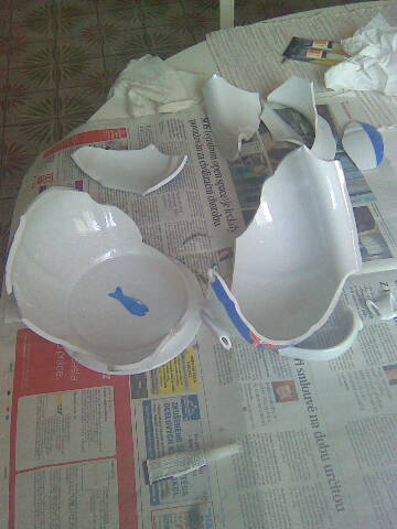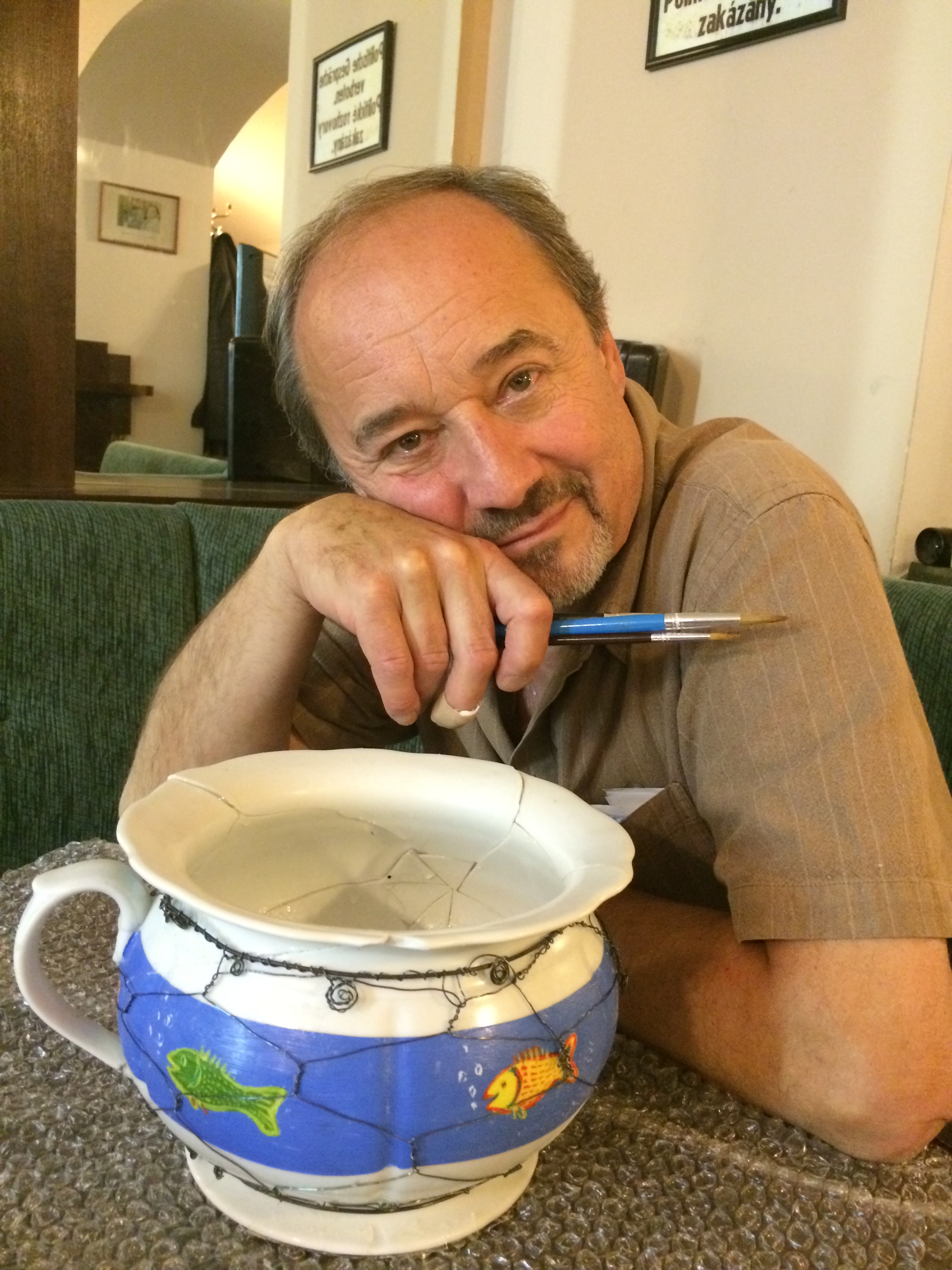 Jeho dílo bylo dokonce hotové už před termínem. Chtěl ho odevzdat dřív, než začne v Muzeu nočníků a historických toalet výstava nočníků i ostatních osobností, která začíná v průběhu června. Nejspíš by byl úplně první, kdyby… „Ještě v noci po představení jsem začal nočník balit do krabice s dřevitou vatou. Odskočil jsem si pro lepenku a za zády se mi ozvala rána. Nočník byl na kusy. Tu noc jsem nespal,“ líčil své noční drama Viktor Preiss. Hned jak ráno vstal, začal jej ze střepů znovu skládat. Pomocí vteřinového lepidla seskládal jednotlivé kousky k sobě a slepil. Aby dílo drželo lépe pohromadě, vlastnoručně ho ještě odrátoval. Jak se mu to podařilo, posuďte sami. Chtěl, aby se jeho nočník vydražil za hodně peněz, aby pomohl přispět co nejvíce. Teď má strach, aby za nočník vůbec někdo zaplatil i pořizovací cenu. „Trochu se stydím, ale věřím, že i padlý nočník zaslouží povšimnutí. Už jen ze soucitu nad zmařeným dílem. Doufám, že si jej někdo opatrně odnese jako neduživé adoptované dítě, možná i jako raritu. Hlavní je, aby se ho někdo dobrý ujal,“ vyjádřil své skromné přání Viktor Preiss.