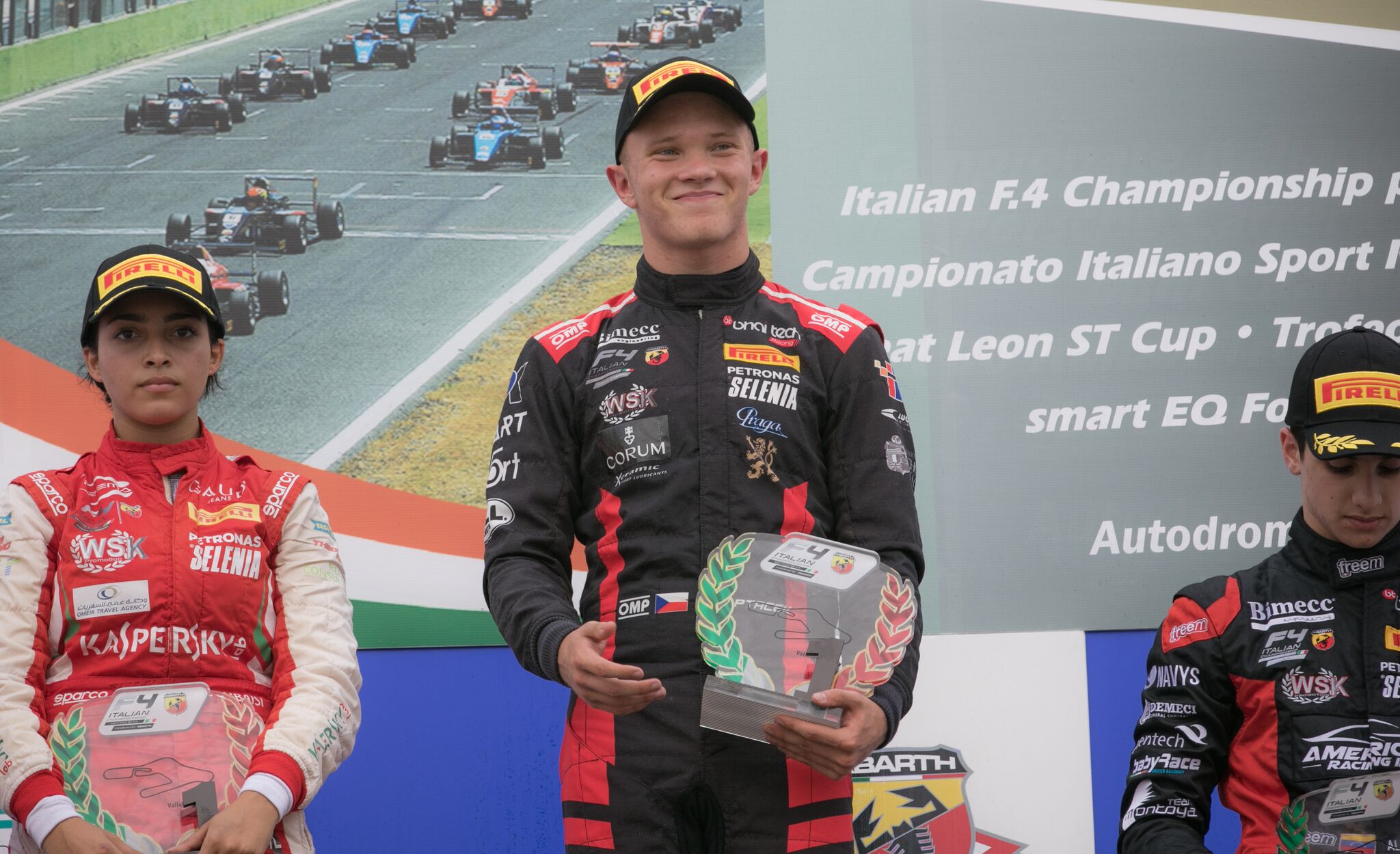 Vyvrcholení italské Formule 4 se chystá na 26.-28. října na okruh Mugello a v žádném případě není vůbec nic rozhodnuto. Dokonce i Petr Ptáček junior se při slibné konstelaci hvězd může reálně dostat v konečném účtování mezi první trojici. Ale bude to mít ze čtvrté příčky hodně těžké. Mimo jiné i proto, že uplynulý víkend byl v naprosté režii Olliho Caldwella. Britský pilot si připsal tři vítězství (za každé 25 bodů) a rázem se dostal do boje o titul. Ze třetího místa ztrácí devětadvacet bodů na druhého Enza Fittipaldiho, dalších devět bodů má k dobru průběžně vedoucí Leonardo Lorandi. Petrův stájový kolega tak nemá zdaleka nic jistého a v říjnu se čeká souboj na ostří nože.