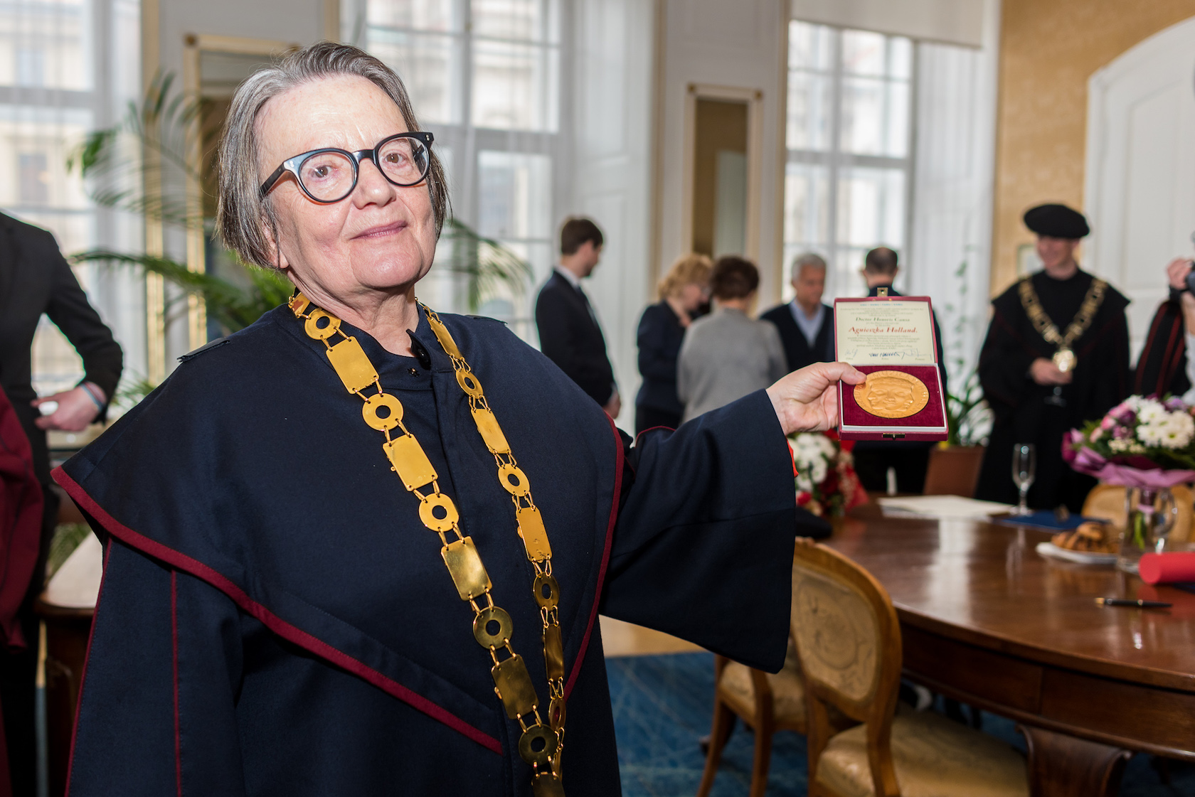 Proslulá polská režisérka a scenáristka převzala stvrzující diplom a zlatou medaili AMU z rukou prorektora AMU Filipa Suchomela. Udělení čestné hodnosti doktorské někdejší studentce FAMU a současné režisérce světového jména Agnieszce Holland je oceněním její dosavadní tvorby v oblasti filmového a televizního umění.
