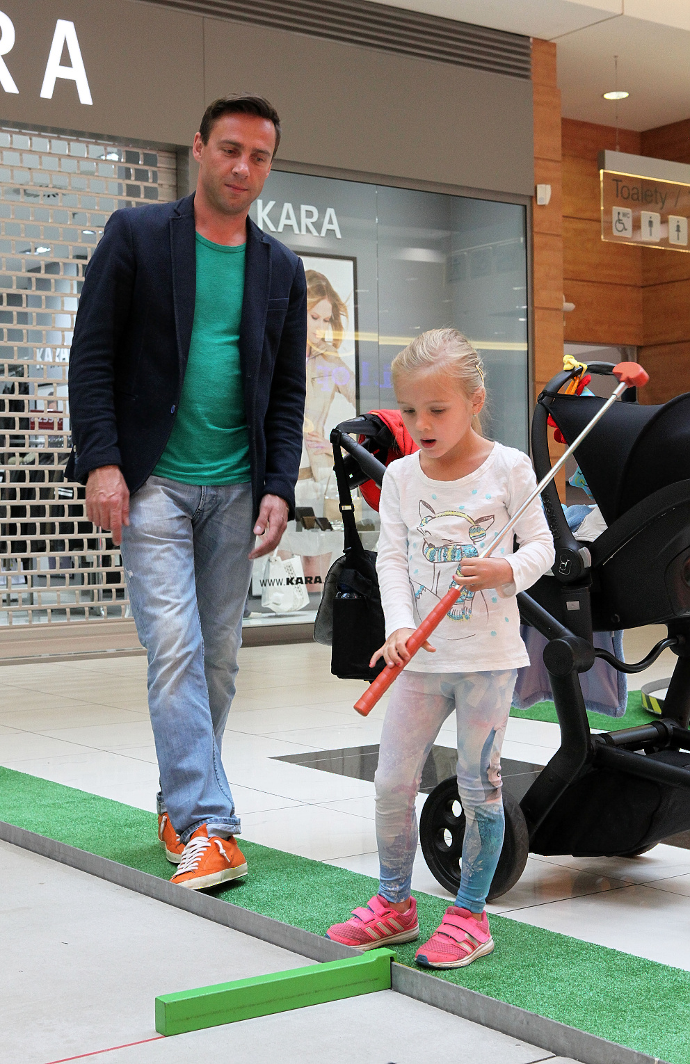 Nejvytíženějším VIP hráčem se stal bezkonkurenčně Roman Vojtek. Přivedl s sebou totiž obě své děti. A zatímco malá Editka se chopila golfové hole, taťka si hleděl jak minigolfu, tak kočárku s čerstvě narozeným Editčiným bráškou. „S tímto sportem mám daleko větsí zkušenosti, než zkušenosti s normálním golfem. A musím se přiznat, že mě daleko víc baví. Hraje se na malým prostoru, nemusíte se nikam registrovat, nakoupit si drahé oblečení a vybavení, přijet drahým autem… a můžu ho hrát i s dětma. Sportuju rád. V mládí jsem dělal vrcholově gymnastiku. Teď mám rád lyže, prkno, kolečkové brusle, nebo potápění na nádech. Čtyřměsíční syn sportuje zatím jen s dudlíkem, ale pětiletá dcera chodí od svých několika měsíců na plavání a na gymnastiku. Jezdíme taky na kole, bruslích a v zimě samozřejmě na lyžích,“ rozpovídal se Roman, který se právě teď plaví na jachtě v Chorvatsku. „Uspořádali jsme takovou pánskou jízdu, společně s našima dětma. Čtyři chlapi a čtyři děti. Je to báječný a moc si to užíváme. A hned jak se vrátím, začínám další den točit hudební film Muzikál aneb cesty ke štěstí. Pak snad stihnu ještě pár dní na chaloupce na Valašsku… no a už tu bude září,“ popsal oblíbený herec své prázdninové plány. A jak se cítil v nákupním centru? „Ač jsem chlap, nakupování mi nevadí. Dokonce mi ani nevadí nakupování oblečení. Samozřejmě to nesmí trvat celé odpoledne, ale koupit něco hezkého pro sebe, nebo své blízké mě prostě baví.“