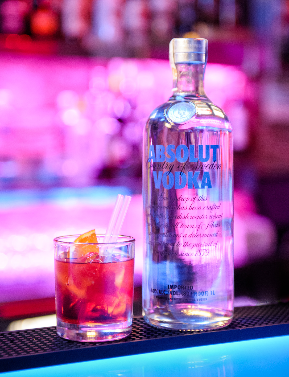 (2 cl Absolut vodky, 2 cl Martini Rosso, 2 cl Amaretta, 2 cl Campari).“