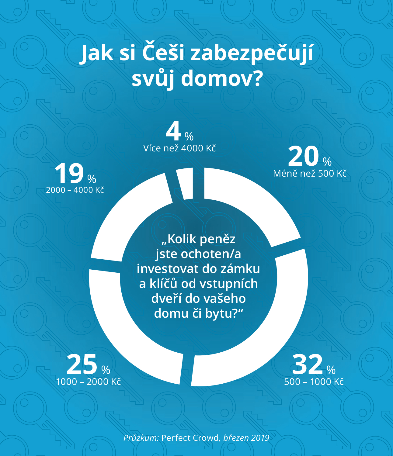 Pouze necelá polovina Čechů (48 %) je ochotna investovat do zámku k domu či bytu více než 1 000 korun. Třetina Čechů (34 %) nemá povědomí o bezpečnostních třídách zámků a prakticky stejný podíl dotazovaných (33 %) používá zámky s klíči, které lze zkopírovat nejen v zámečnictví, ale například i v opravně obuvi. Plyne to z průzkumu realizovaného na začátku března, který byl zaměřen na úroveň zabezpečení českých domácností a jejich majetkové pojištění.
