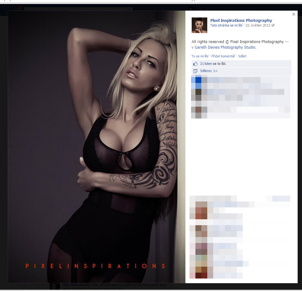 Co je ovšem již méně sporné je to, že pan Svoboda před několika dny stáhl z internetu fotografii anglického fotografa Garetha Daviese, kterou ořízl o část, kde byl velký podpis fotografa, a tuto fotografii umístil do své galerie na největším komunitním serveru pro fotografy a modelky fotopatracka.cz s popiskou „alenka 1“ a na svůj facebookový profil.