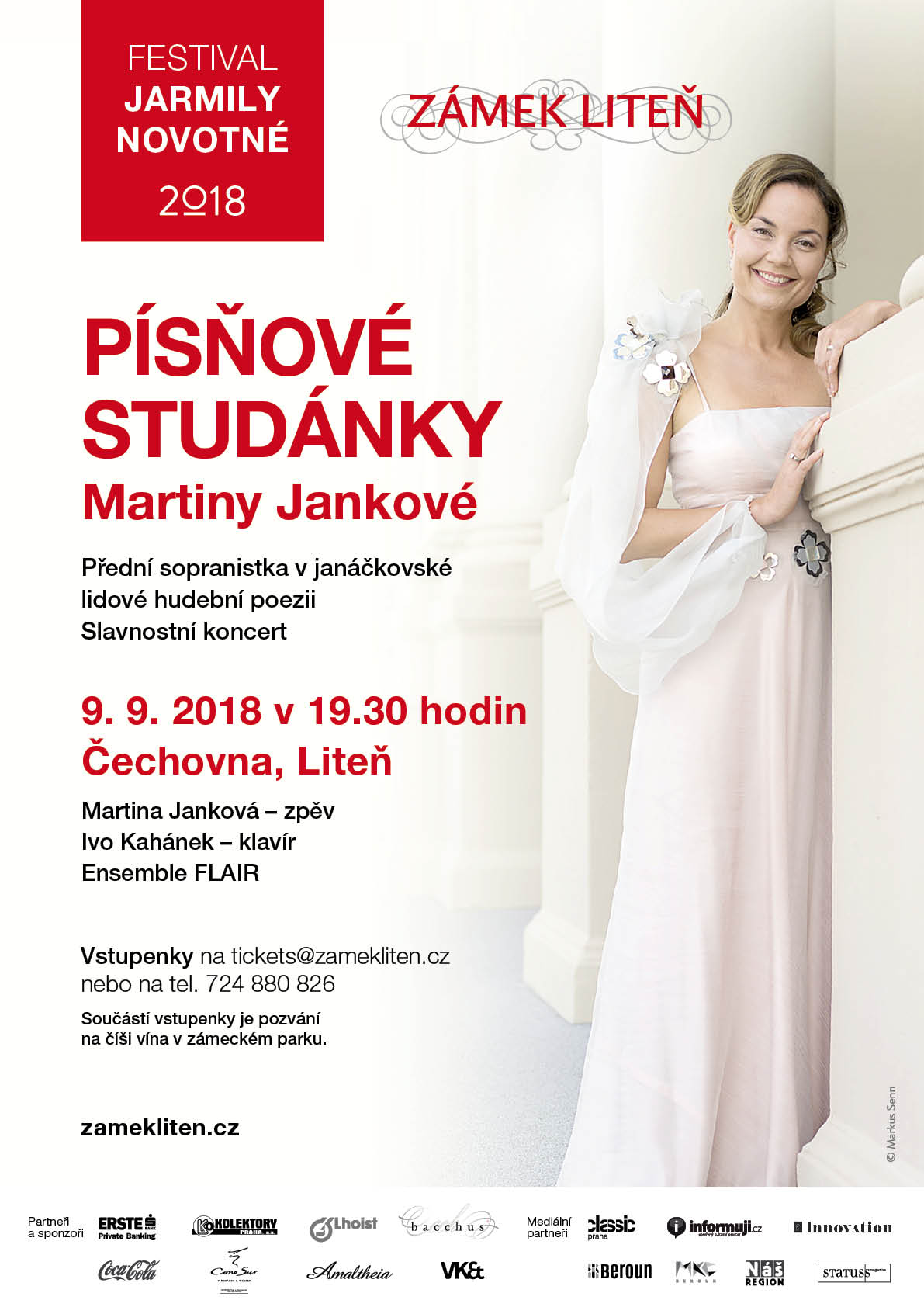 Písňovým recitálem jedné z našich nejzářivějších sopranistek Martiny Jankové dospěje do finále 7. ročník Festivalu Jarmily Novotné. Pěvkyně s průzračným sopránem vystoupí v neděli 9. zářípři slavnostním koncertu s názvem Písňové studánky Martiny Jankové v barokní budově Čechovny v areálu zámku Liteň. Podobně jako kdysi věhlasná Jarmila Novotná podporovala zpěvem svou vlast, navrátí se sopranistka žijící ve Švýcarsku do své domoviny, aby jí v moravské i janáčkovské lidové hudební poezií složila svou poctu. Její vystoupení bude současně symbolickou oslavou skladatele Leoše Janáčka, jehož 90. výročí úmrtí připadá právě na letošek. Po boku Martiny Jankové se rovněž představí žádaný klavírista Ivo Kahánek spolu s folklórním tělesem Ensemble FLAIR.