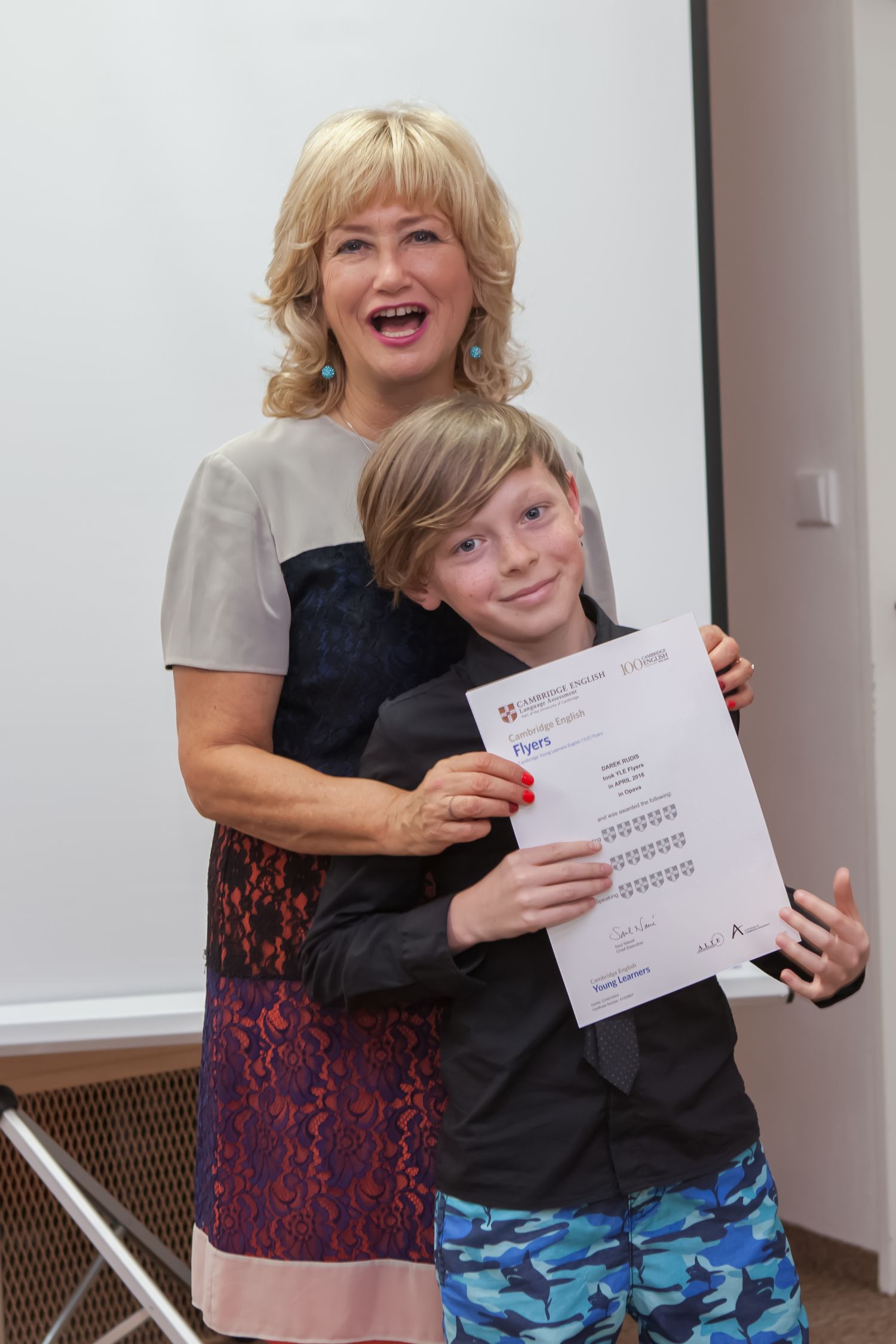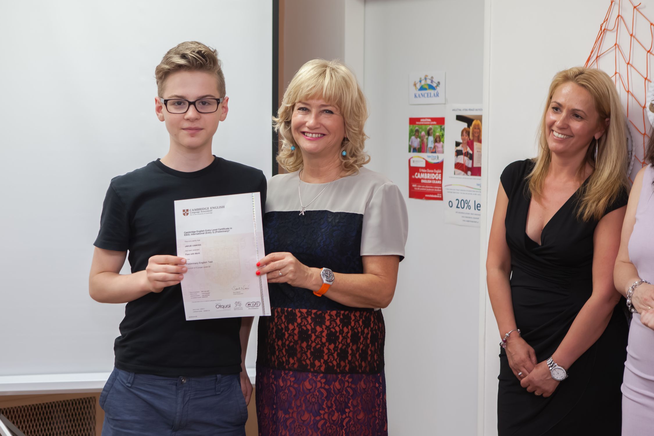 „Jedním z nich je můj prostřední syn Jakub (14let),“ pochlubí se hrdá maminka a dodává, že syn studuje na gymnáziu a z angličtiny má samozřejmě jedničku. „A právě tyto dny obdržel již podruhé přímo z rukou Helen Doron certifikát z testů Cambridge!“ Markéta Vaníčková dodává, že během nedávné návštěvy zakladatelky Výukového centra v Čakovicích převzalo certifikát celkem 28 dětí, což je obrovský úspěch.