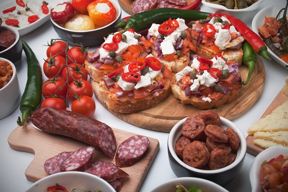 - Tapas, antipasto or meze, mediterranean cold buffet food isolated on white background