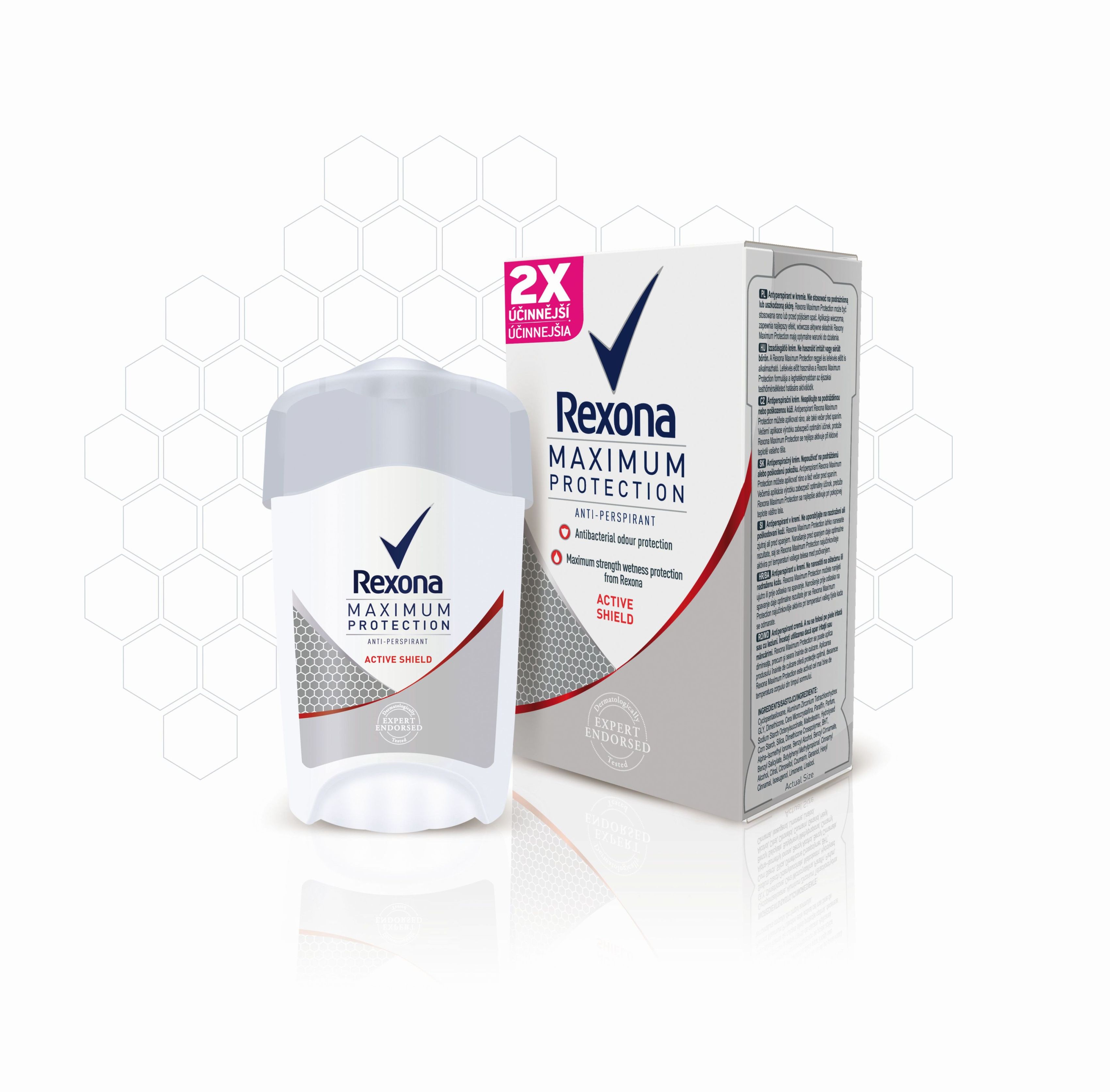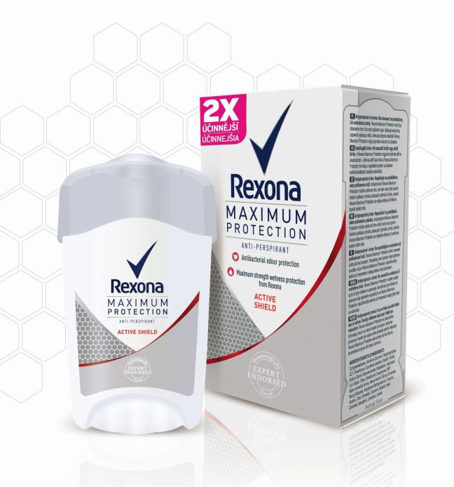 Antiperspirant Rexona Maximum Protection je díky inovativní technologii TRIsolid dvakrát účinnější proti pocení1 a poskytuje pocit jistoty a svěžesti ve všech situacích až po dobu 48 hodin. Nyní na trh přichází i jeho další varianta – Rexona Maximum Protection Active Shield. Nový antiperspirant Rexona Maximum Protection Active Shield chrání před nepříjemným zápachem, který způsobují bakterie.