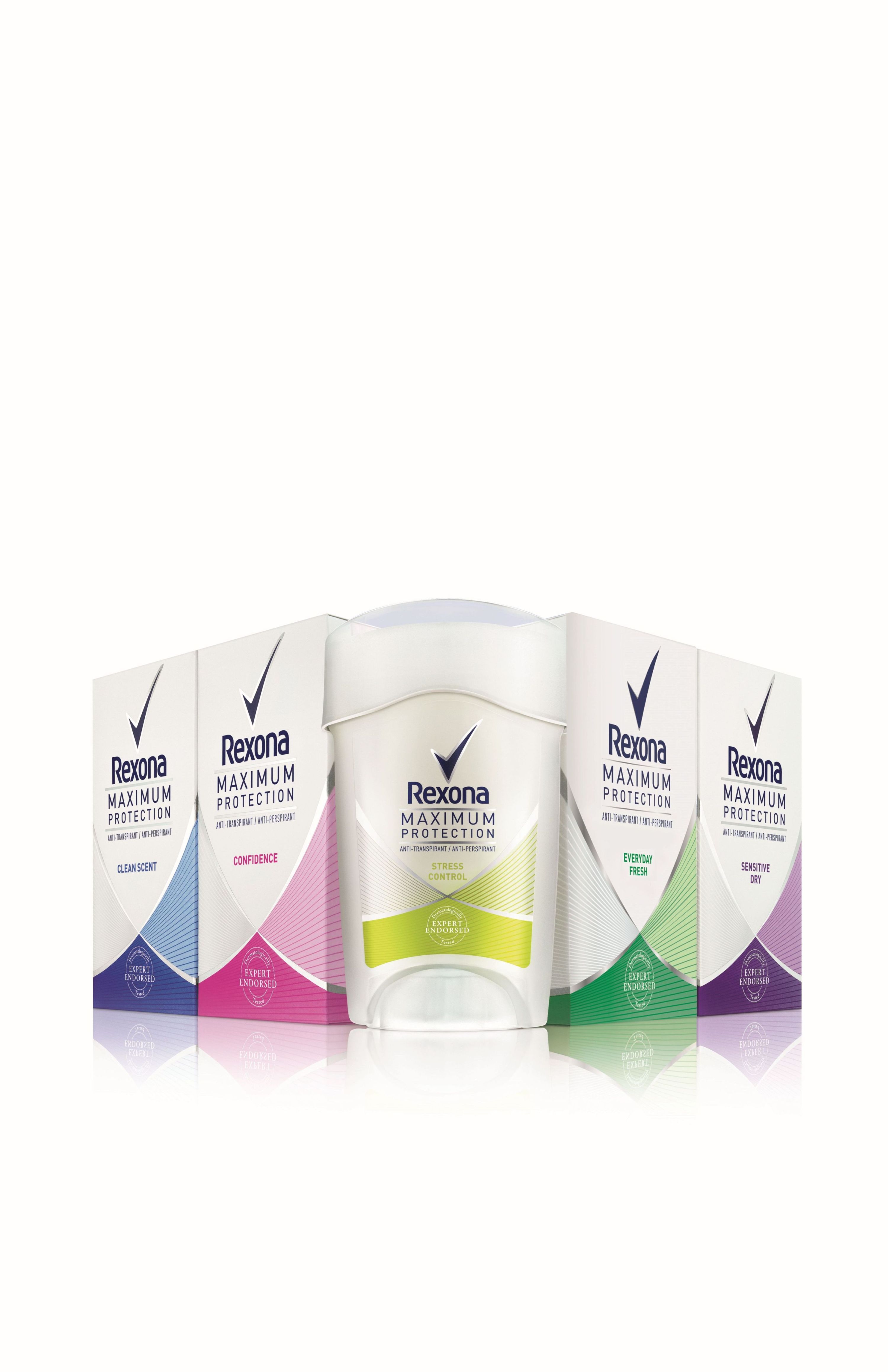 Nabídka dále zahrnuje 5 oblíbených dámských variant Rexona Maximum Protection: Clean Scent, Everyday Fresh, Sensitive Dry, Confidence a Stress Control a Clean Scent verzi pro muže. Všechny antiperspiranty Rexona Maximum Protection se prodávají za nezávaznou doporučenou spotřebitelskou cenu 159,90 Kč (45 ml).