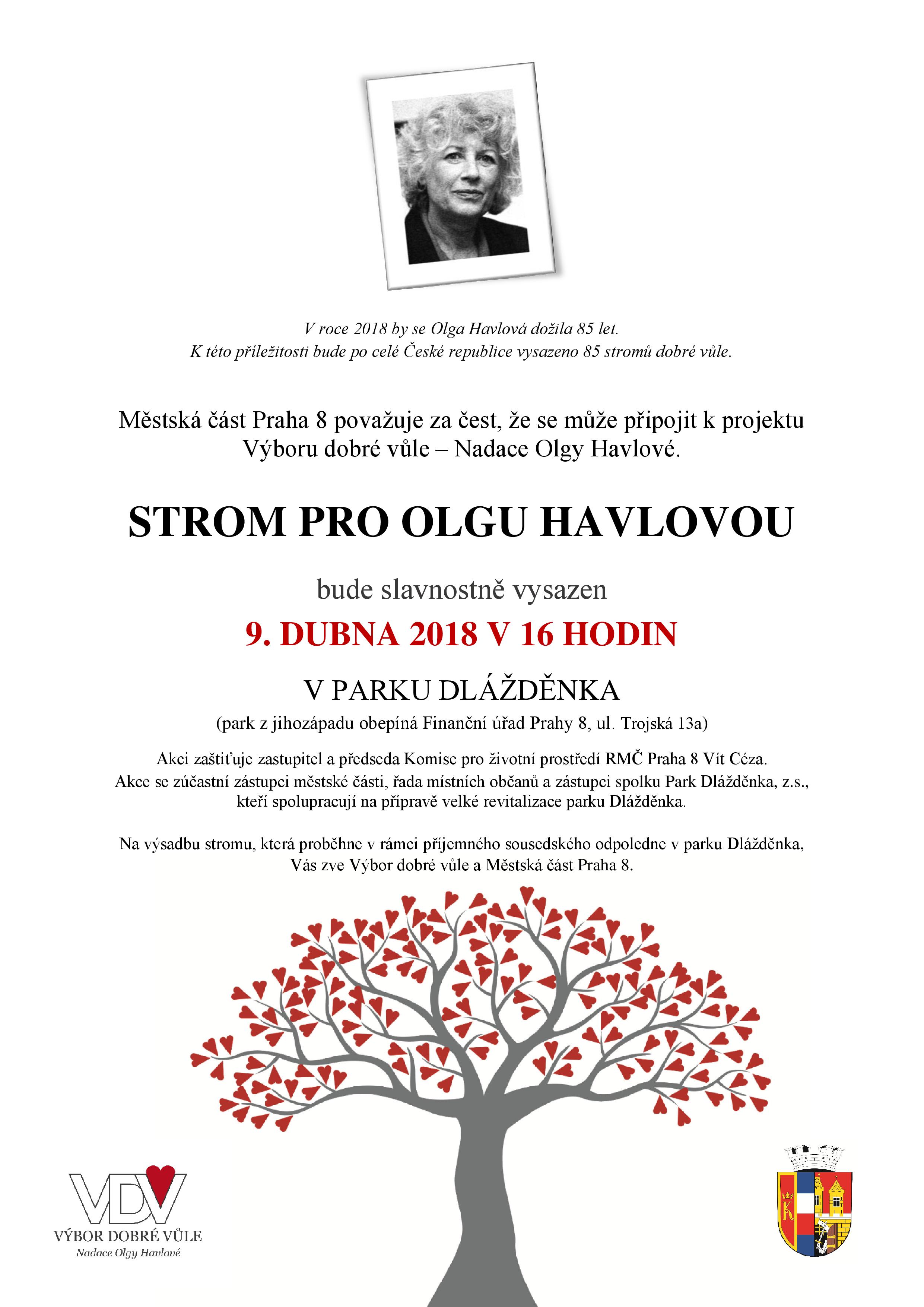 „V roce 2018 by se Olga Havlovádožila 85 let. K tomuto výročí a připomínce obdivuhodné ženy a jejího úsilí v oblasti lidských práv připravila její nadace krásnou vzpomínkovou akci, ke které se naše městská část nesmírně ráda připojuje,“ uvádí Vít Céza, zastupitel MČ Praha 8 a předseda komise pro životní prostředí. „Považujeme za čest, že jeden z pouhých 85 stromů bude vysazen také v parku Dlážděnka,“ dodává V. Céza. Akce Strom pro Olgu Havlovou navazuje na první vysazený strom dobré vůle. Lípu zasadila Olga Havlová osobně v Olomouci v roce 1993.