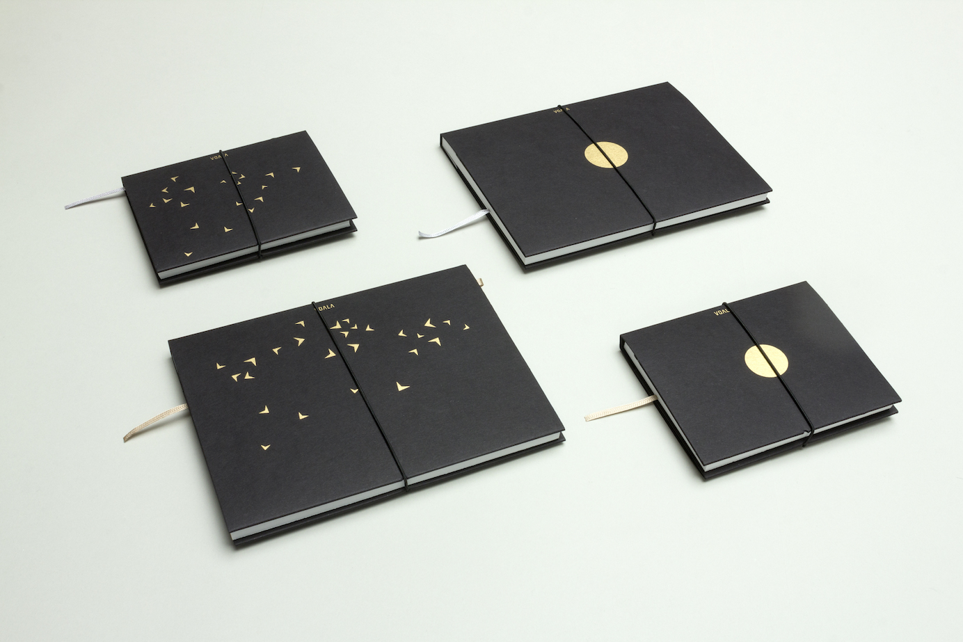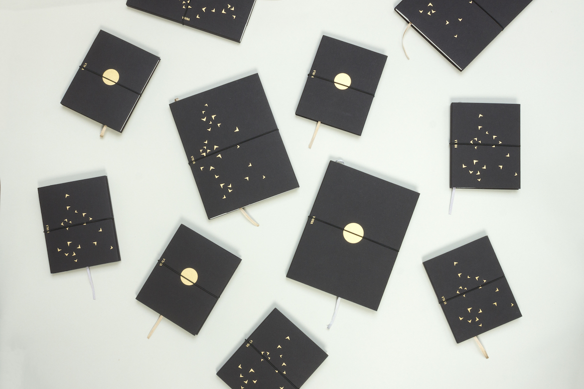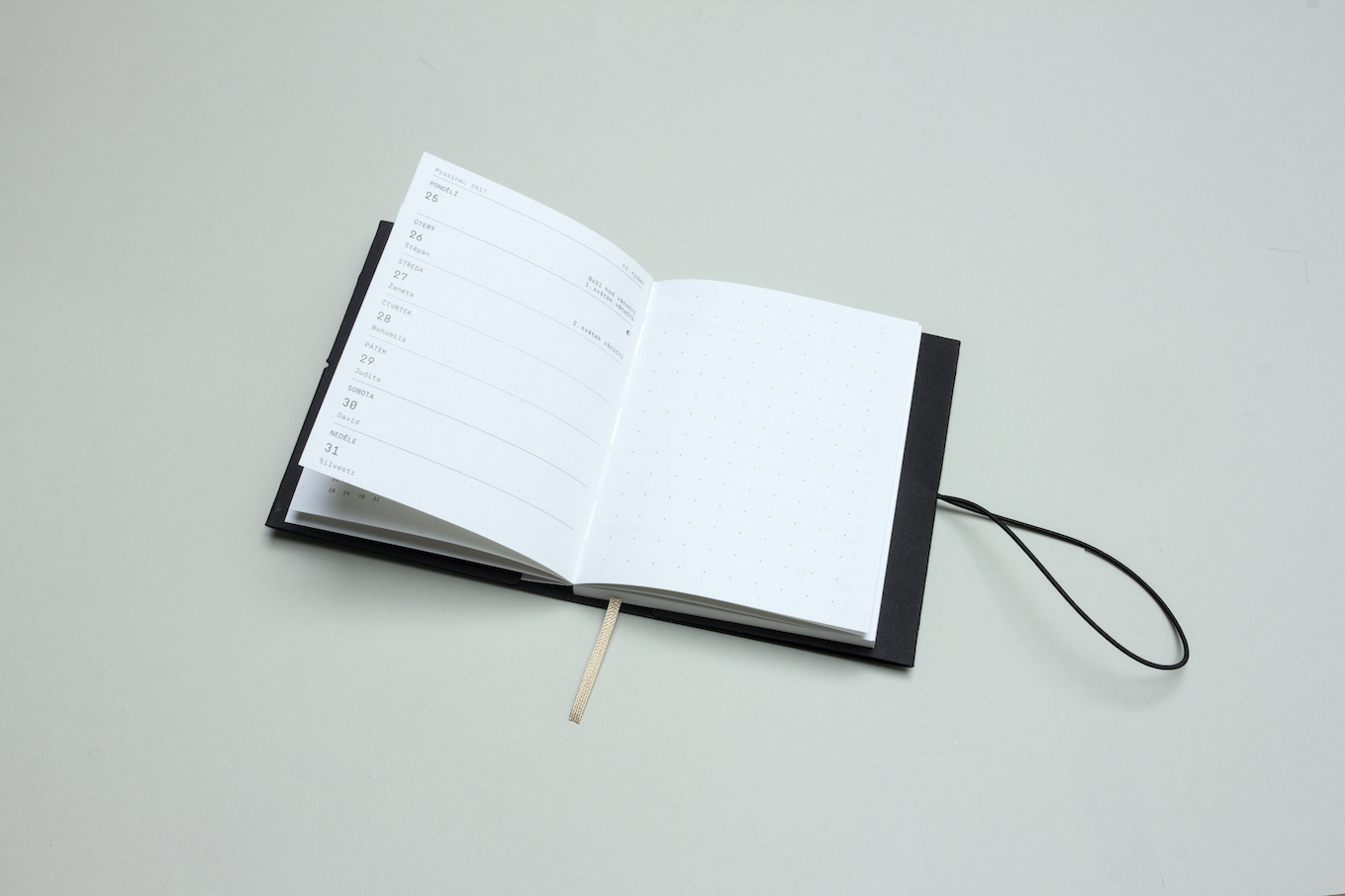 Kolekce diářů pro rok 2018, které připravili profesionální grafici studia Voala, navazuje na velice úspěšnou kolekci z loňského roku. Černé diáře se zlatým ražením jsou k dispozici ve dvou velikostech a provedeních. Uvnitř pevného papírového přebalu, který ukrývá vnitřní kapsu, najdete blok z recyklovaného papíru s týdenním kalendáriem a dostatkem volných stran pro všechny vaše plány. To vše přepásáno praktickou gumičkou v černočerné barvě.