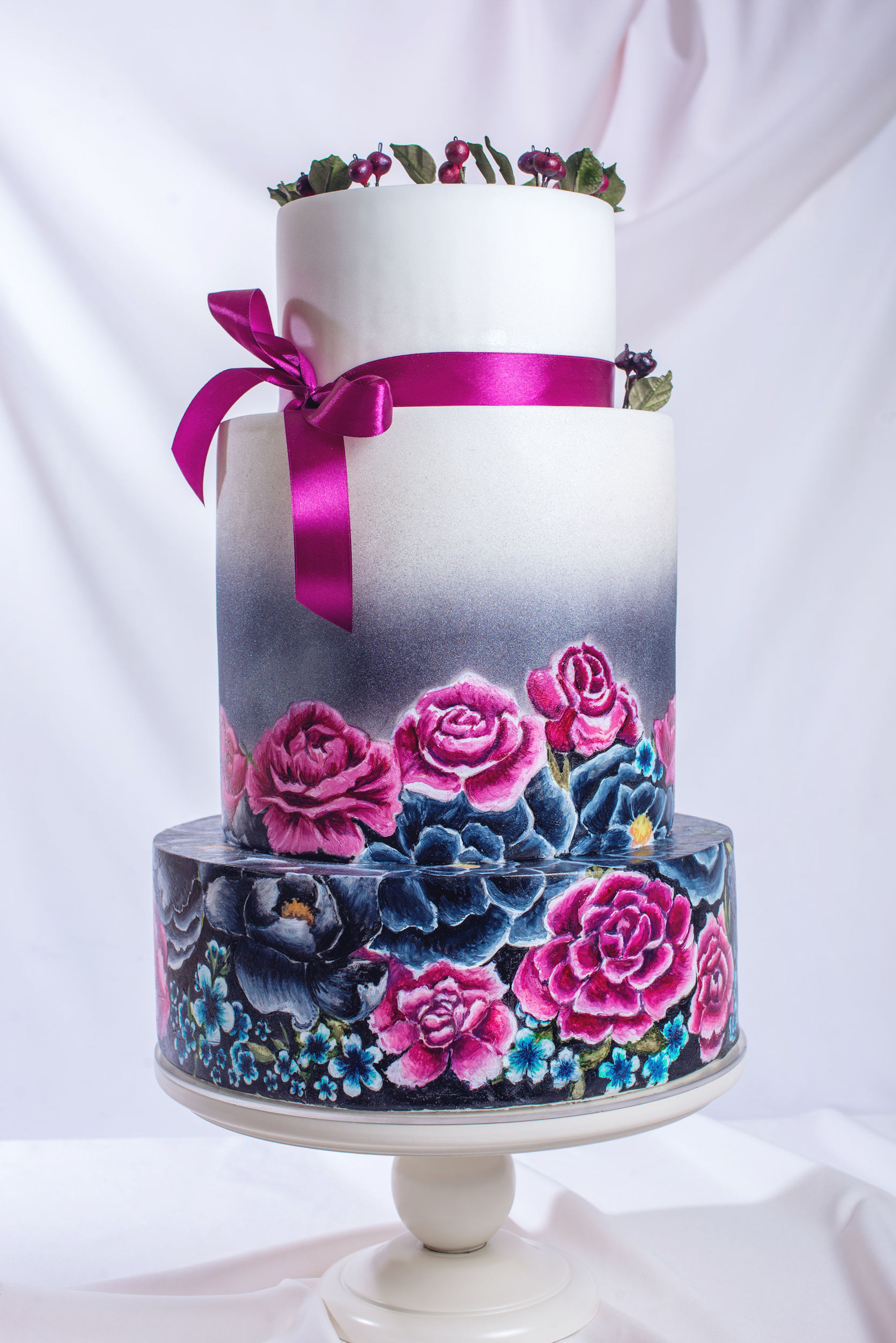 - 73790680 – large wedding cake ornamented in a traditional rustic style blue and purple roses and ribbon with the berries on top of a background of wavy fabric. food design. trends