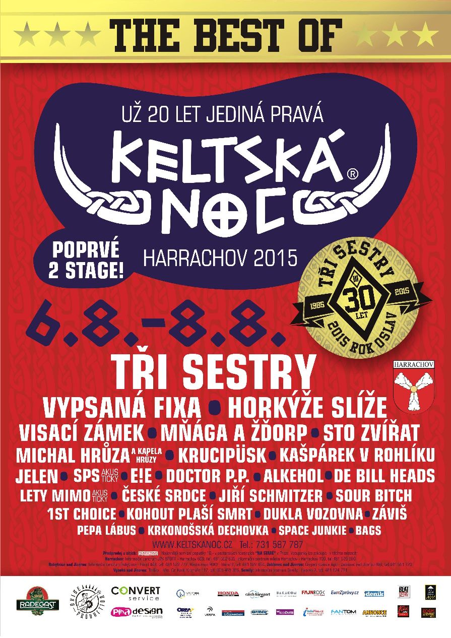 Dvacátý ročník Keltské noci se uskuteční 6. – 8. 8. 2015 v Harrachově na doskočišti Mamutího můstku a bude třídenní! Festival v Harrachově si připisuje hned dvě výjimečnosti oproti jiným festivalům, a to za festival s nejlepším výhledem a festival pořádaný v nejvyšší nadmořské výšce v ČR! Kde jinde tohle všechno najdete! Zahájení bude tradičně patřit Krkonošské Dechovce a dále se na podiu během dvou dnů vystřídají: Sto Zvířat, Vypsaná fixa, Visací Zámek, Krucipüsk, Michal Hrůza a kapela hrůzy, České Srdce, Sour Bitch, Kohout plaší smrt, Mňága a Žďorp, Hokrýže Slíže, Doctor P.P., E!E, Kašpárek v Rohlíku, Alkehol, Jiří Schmitzer,Dukla Vozovna, De Bill Heads, Jelen a mnoho dalších. Vyvrcholení oslav 20tých a 30tých narozenin obstará veselá „domácí“ parta TŘI SESTRYA co dalšího na vás v Krkonoších čeká: dětský koutek, oddychová zóna, hrací zóna, stanové městečko přímo na doskočišti mamutího můstku, stánky se suvenýry, občerstvení, výčepní místa a čerstvý horský vzduch ke Keltské noci neodmyslitelně patří. Pro všechny milovníky adrenalinu máme nabídku na zlevněný Bungee Jumping z televizní věže.