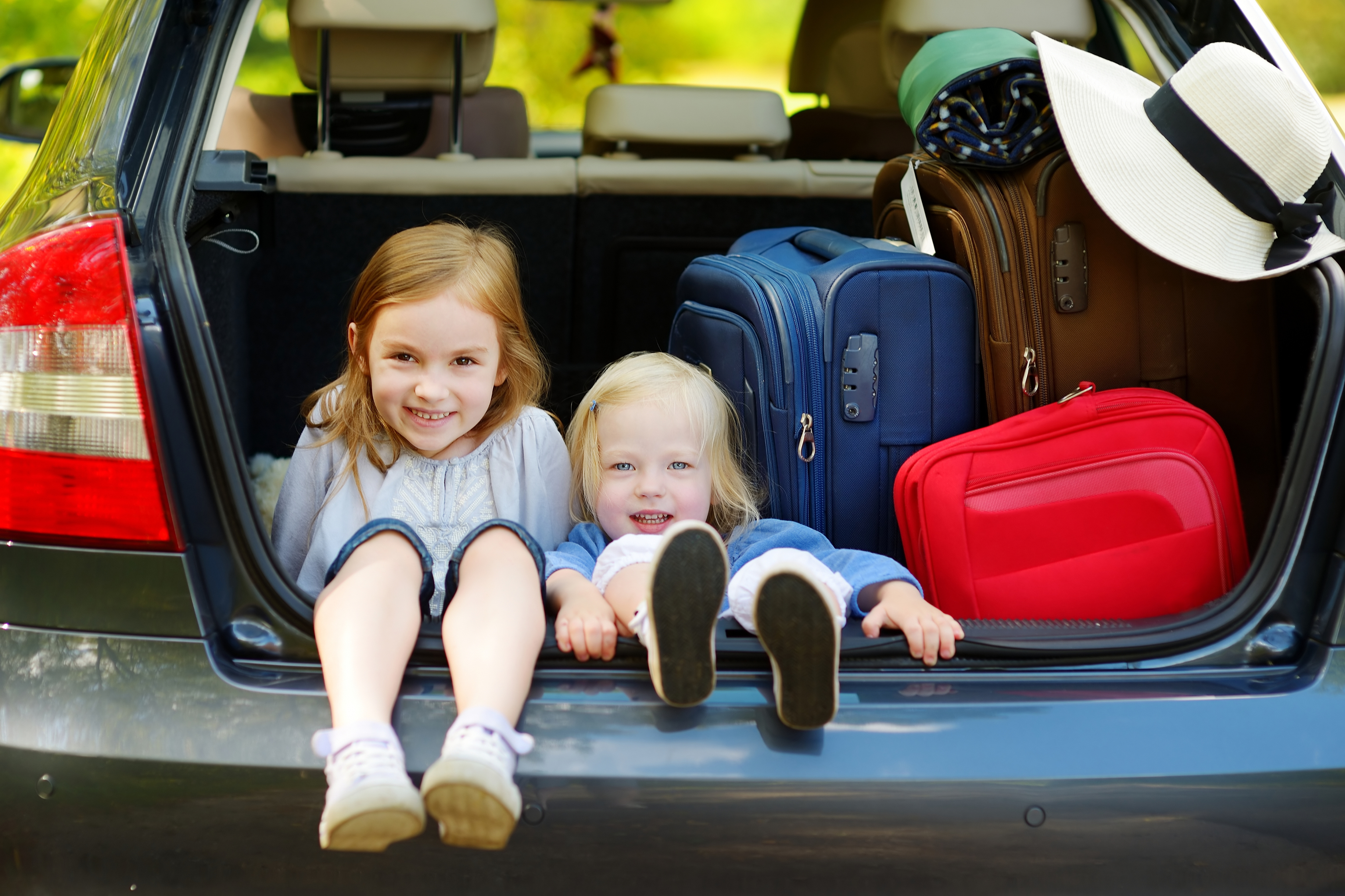 - Two adorable little sisters sitting in a car just before leaving for a car vacation with their parents