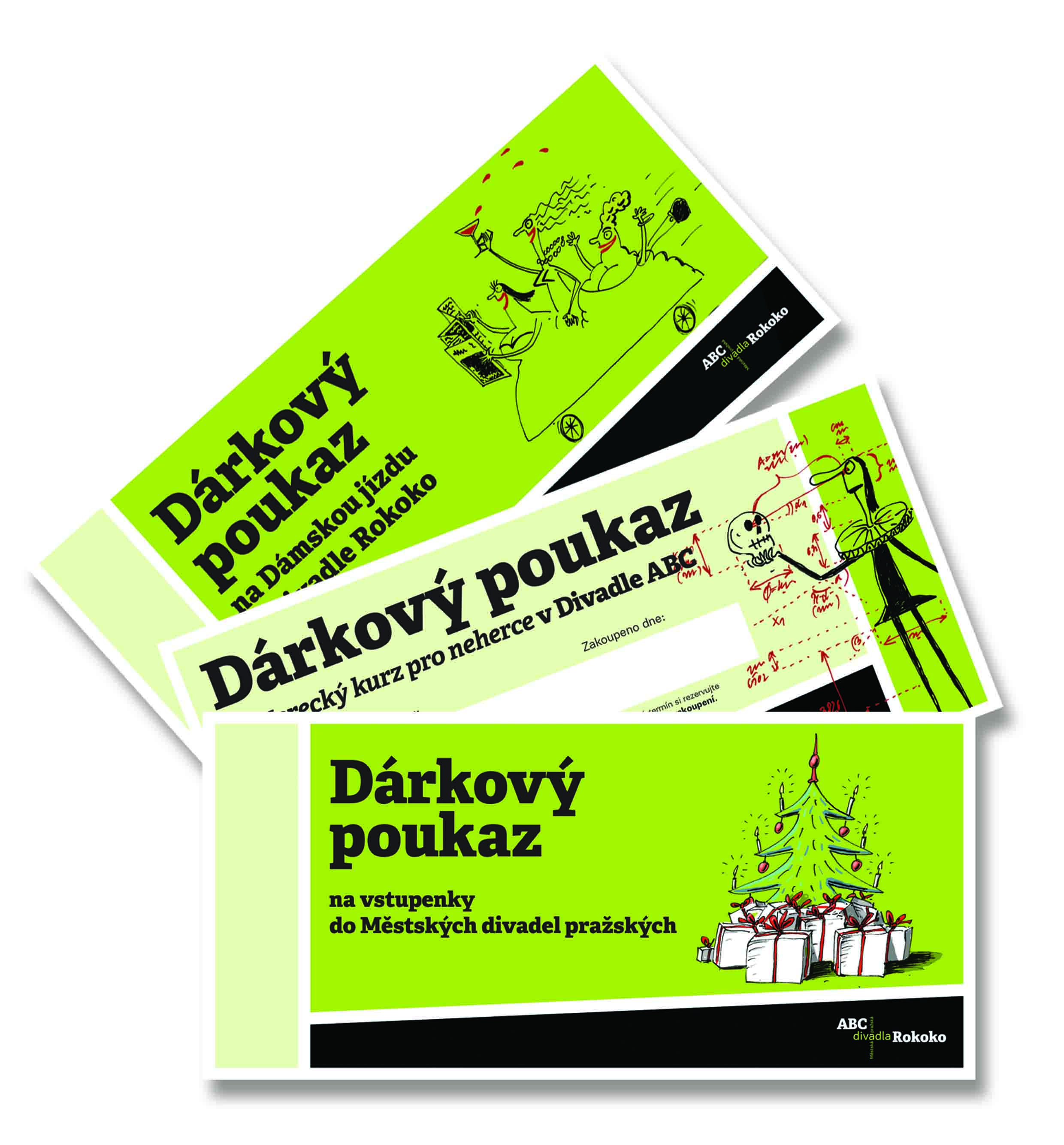 Darovat můžete i dárkové poukazy, svým blízkým nadělíte dvě libovolné vstupenky na představení, Dámskou jízdu, Herecký kurz pro neherce nebo nově na hravé odpolední workshopy pro děti Divadelní ABCeda.