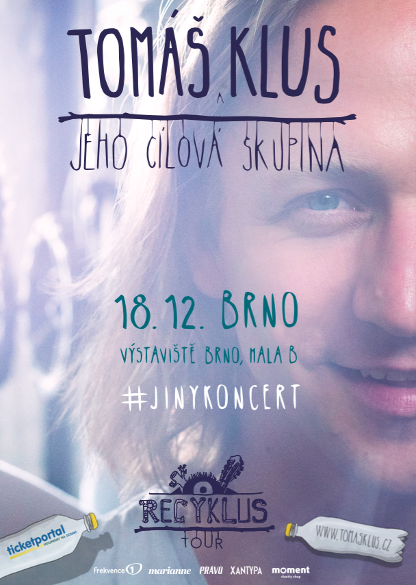 Podzimní Recyklus tour Tomáše Kluse a jeho Cílové skupiny se chýlí ke konci, uzavře ho 18. prosince od 19.00 #jinykoncert v působivém prostoru Výstaviště Brno (Hala B). Návštěvníci obohaceného a výjimečného koncertu mohou v předsálí již od 16.30 načerpat síly před hudebním zážitkem v odpočinkové zóně při poslechu demo verzí starších písniček Tomáše Kluse a pochutnat si na dobrém jídle. Chybět nebude ani voda zdarma. Na koncertě zahraje předkapela – nedávno založené hudební duo MEME, které tvoří členové kapely Mandrage Matyáš Vorda a František Bořík. Pozvání přijal také další speciální host, jehož jméno zůstane pro návštěvníky koncertu do poslední chvíle překvapením.