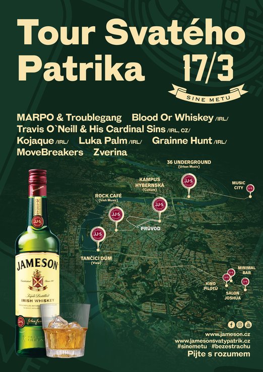 Sledujte www.toursvatehopatrika.cz #BezeStrachu, #SvatyPatrik či Facebook Jameson, kde postupně najdete kompletní informace. Vstup do Rock Café a 36 Underground bude zpoplatněn, stačí si na jednom z těchto míst koupit za 150 Kč vstupenku a ta automaticky platí i do druhého prostoru. Předprodeje nejsou k dispozici, vstupenky lze zakoupit pouze na místě a ke vstupu dostane každý welcome drink Jameson. Na ostatní lokality je vstup zdarma, všude však od 18 let.