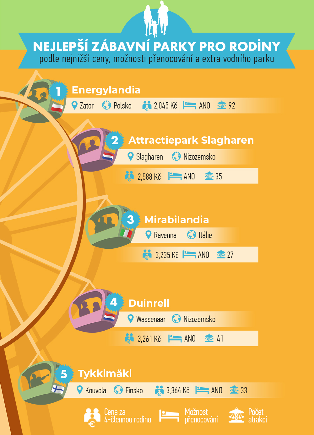 Co je lepší než zábavní park? Zábavní park s aquaparkem a hotelem! Pokud hledáte tip na víkendový výlet s dětmi, tyto parky jsou přesně pro Vás! Na seznamu najdete evropské zábavní parky nejvíce orientované na rodiny, které mají i aquapark a možnost ubytování. Například v parku Energylandia si můžete užít víkend s rodinou již za 2045 Kč na den. V této ceně však není zahrnut vstup do aquaparku.