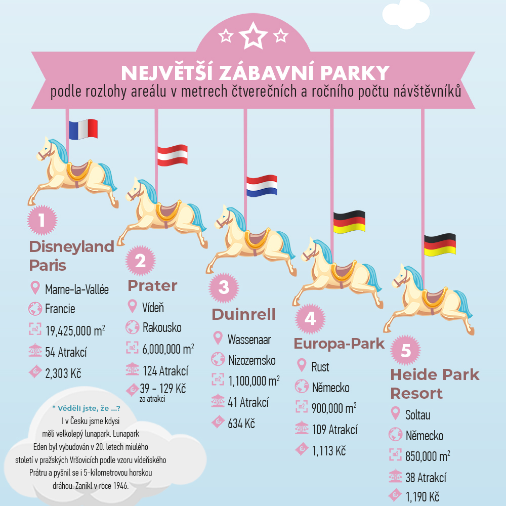 V Evropě najdete mnoho parků, ve kterých se klidně můžete toulat i týden a ještě se ani nezačnete nudit. Neztratit se v nich, to je skutečné umění! Infografika od ShopAlike Vám za pomoci veřejně dostupných informací představí pět těch největších, na základě rozlohy a ročního počtu návštěvníků. Absolutním vítězem v kategorii obrovských lunaparků je Disneyland v Paříži, který se svou rozlohou 19,425 km² překoná i Monako (2.02km²), Gibraltar (6.7km²) a Vatikán (0.44km²) dohromady!