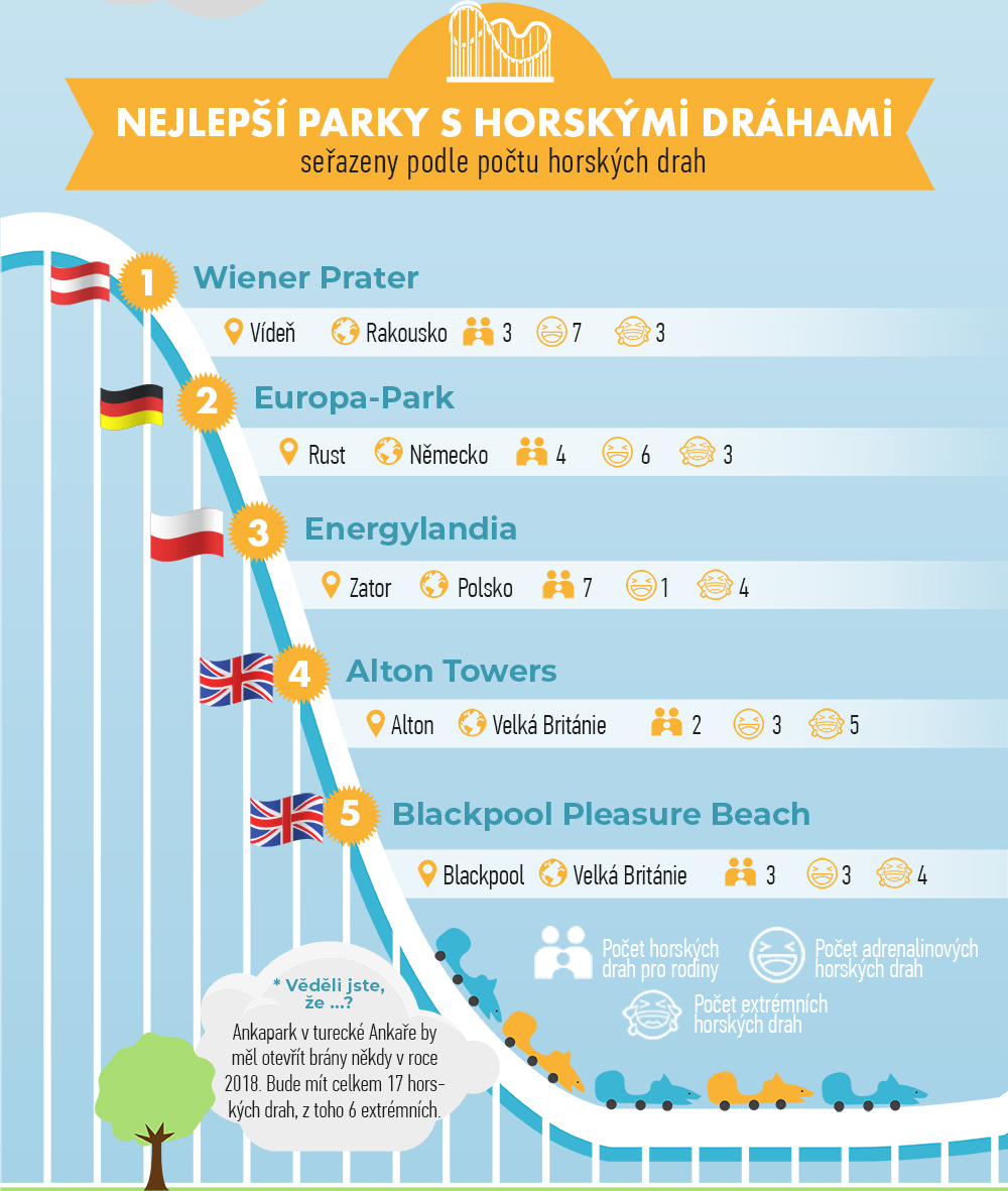 Zábavní parky jsou zde pro všechny. Některé se zaměřují spíše na rodinné zážitky a jiné se naopak snaží přilákat návštěvníky hledající vzrušení. V kategorii zábavních parků s nejlepšími horskými dráhami najdete přehled top parků pro fanoušky extrémů. Nejvyšší a nejrychlejší horskou dráhu najdete například ve španělském Feri Land. Horskou dráhu s nejvyšším počtem inverzí zase v Alton Towers v Británii.2