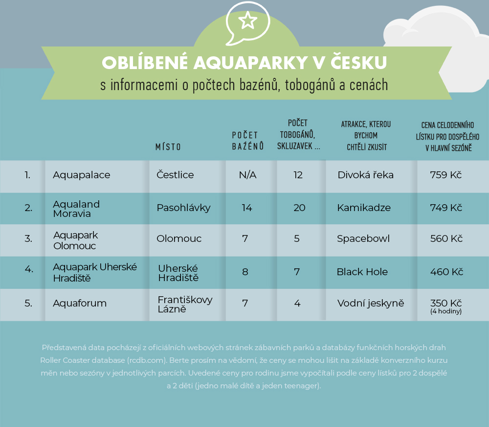 atrakcí. Den plný zábavy zde jednoho dospělého stojí 759 Kč. Následuje Aqualand Moravia v Pasohlávkách u Brna. Pyšní se 14 bazény a 20 tobogány a skluzavkami. Denní lístek pro dospělého zde vyjde na 749 Kč. Pobavit se můžete i v Aquaparku Olomouc, kde za vstup do vnitřního areálu a letního parku se 7 bazény a 5 tobogány a skluzavkami zaplatíte dohromady 560 Kč. V Aquaparku Uherské Hradiště zaplatí jeden dospělý za vstup do vnitřní zóny se zábavným bazénem a tobogány a do letního parku celkem 460 Kč na den. Aquaforum Františkovy Lázně Vám zase nabízí 7 bazénů a 4 tobogány a skluzavky za 350 Kč na 4 hodiny.