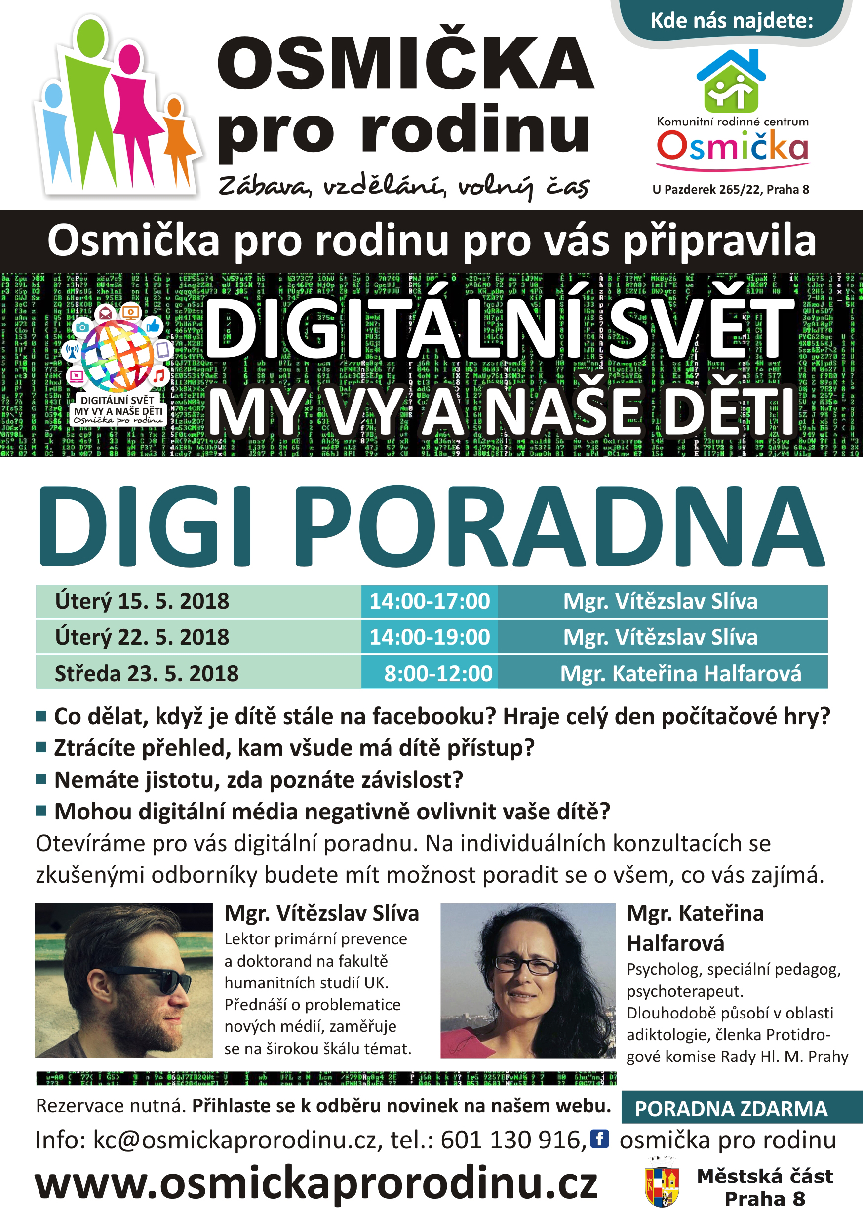 DIGI PORADNA bude fungovat od 15. 5. 2018 v Komunitním rodinném centru Osmička, U Pazderek 265/22, Praha 8.