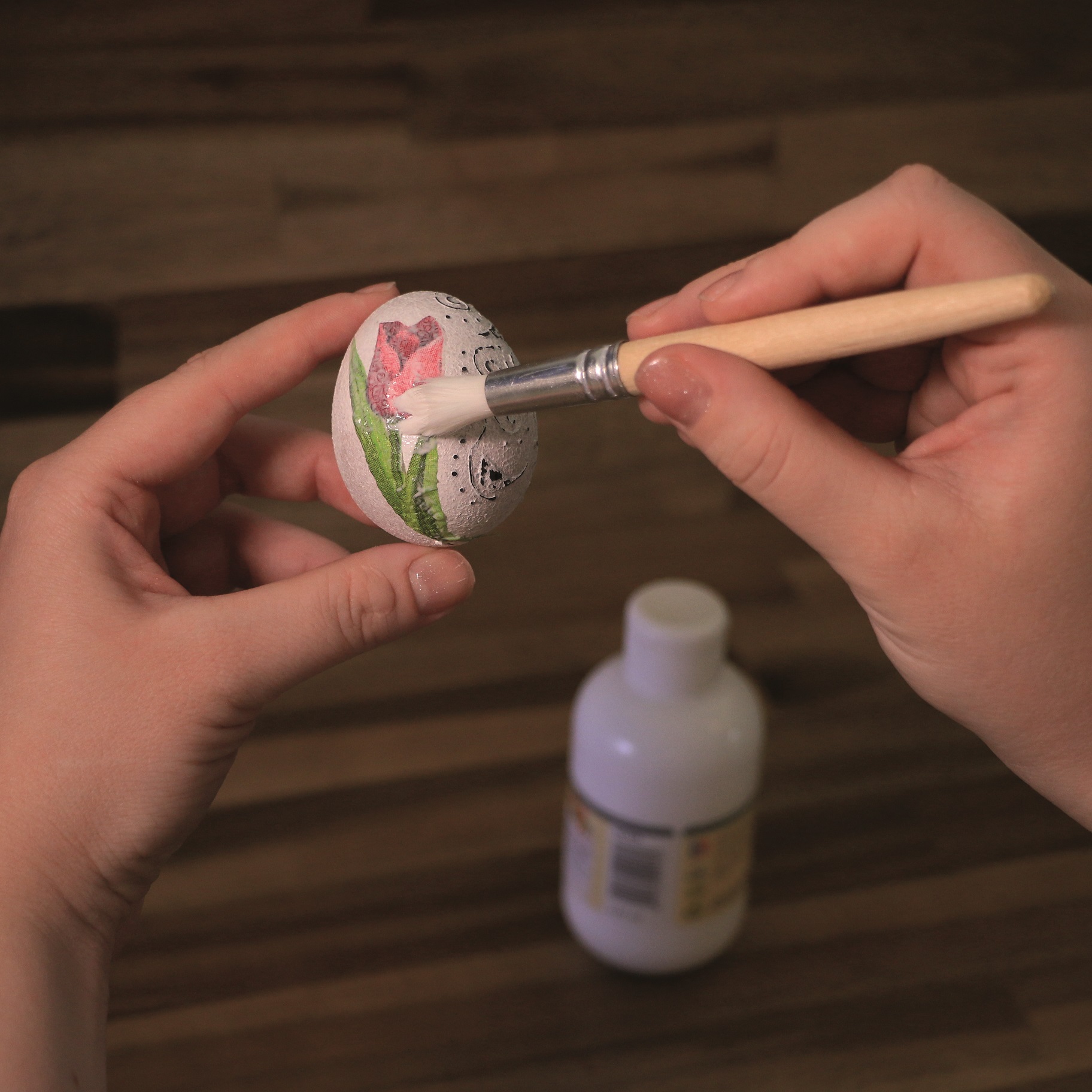 Po zaschnutí vezměte smirkový papír a lehce obruste vrstvu z nakresleného dekoru. Tím vznikne vintage dekor. Pro podtržení celkového vzhledu použijte ubrouskovou metodu. Z ubrousku si vystřihněte obrázek, sejměte z něho bílé vrstvy a aplikujte je na vajíčko pomocí lepidla a štětce. Stačí pár minut a dokonalé vajíčko je na světě.
