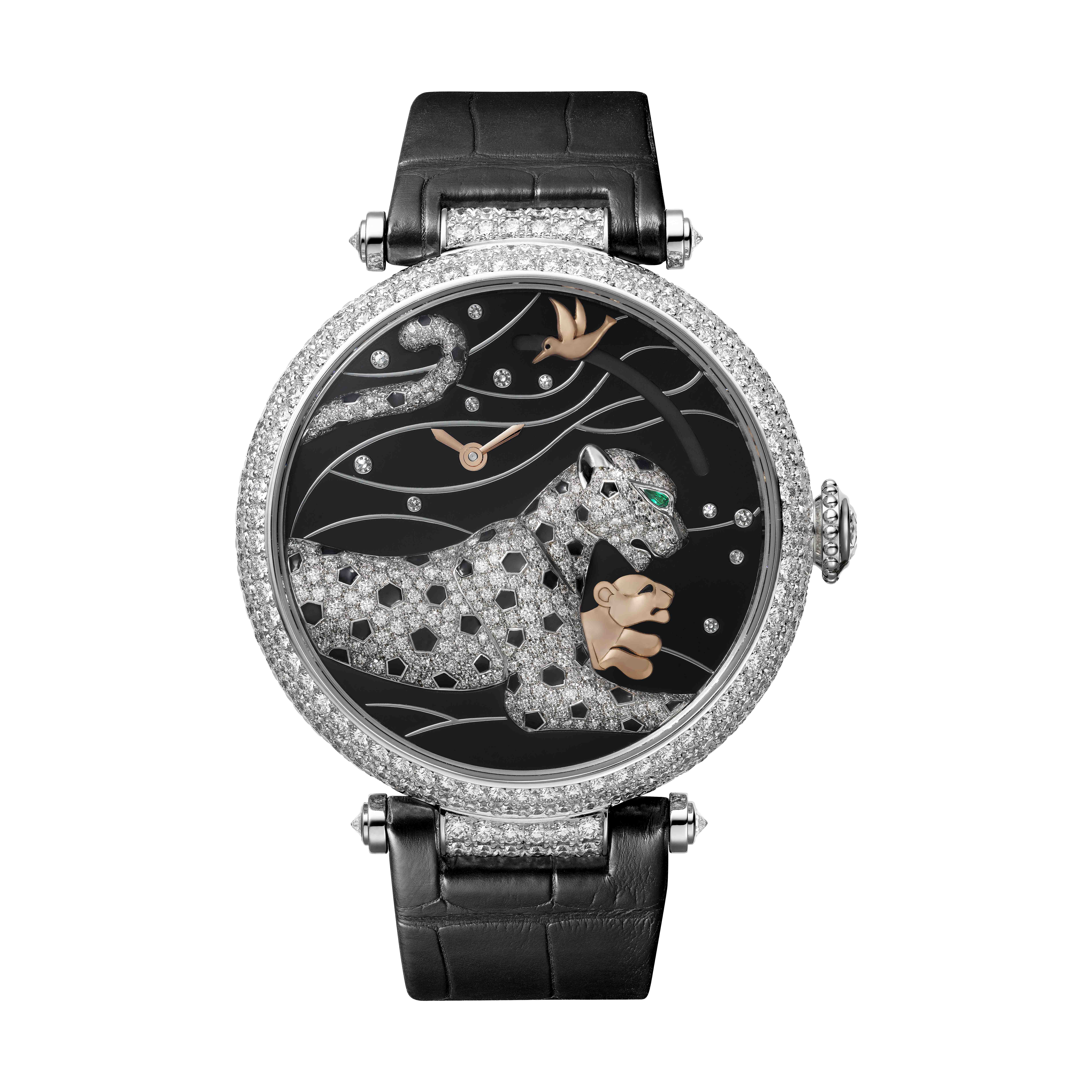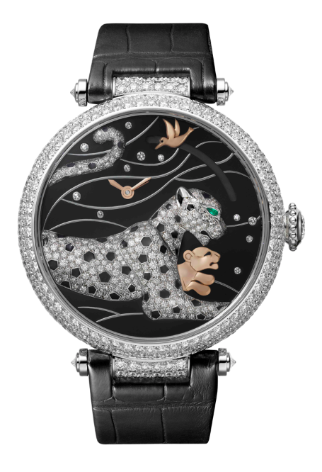 Panter je ve světě Cartier všudypřítomným symbolem. Ať už figurativní nebo abstraktní, dodává kreacím Cartier ženskost a propůjčuje jim svoji propracovanou siluetu. Na hodinkách Panthères et colibri je panter vyobrazen odpočívající s kolibříkem nad hlavou. Kouzelný výjev se v momentě stlačení korunky promění a odhalí panteří mládě ukryté v tlapách matky, nyní hravě pronásledující zlatavého ptáka. Takto aktivovaný mechanismus je ve skutečnosti ukazatelem rezervy chodu. V novém kalibru 9915 MC je zbývající čas ukazující časovou rezervu, za kterou je manufakturní mechanický strojek s manuálním nátahem potřeba natáhnout, indikován délkou trajektorie ptačího letu. Estetika hodinek je se svým propracovaným zdobením ohromující: rhodiované pouzdro z 18 karátového bílého zlata je osazeno 314 diamanty briliantového brusu a tvoří kontrastující aureolu světla kolem temně černého ciferníku. Impozantní šelma je vyvedena z bílého zlata posázeného diamanty a skvrnami z černého šperkařského smaltu.