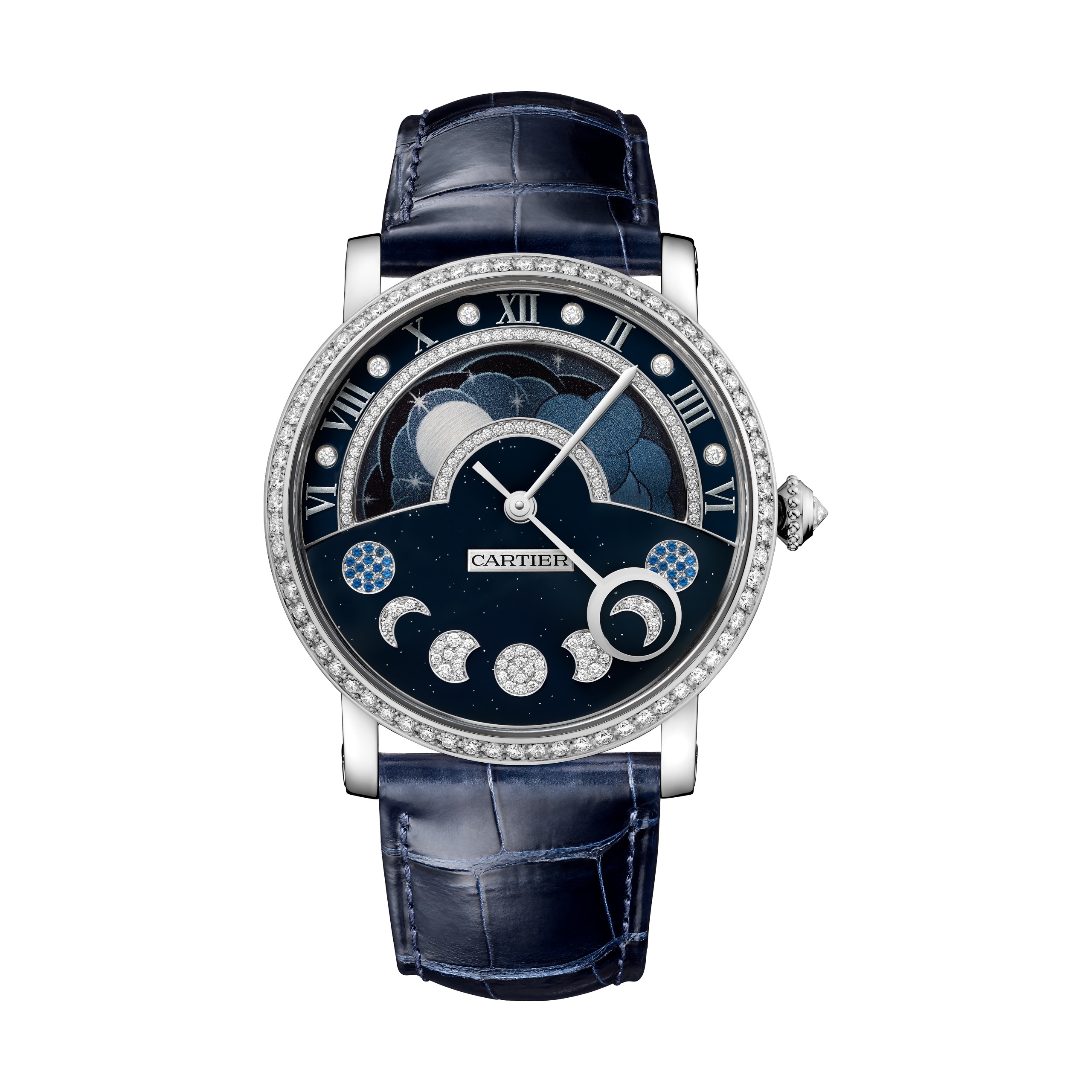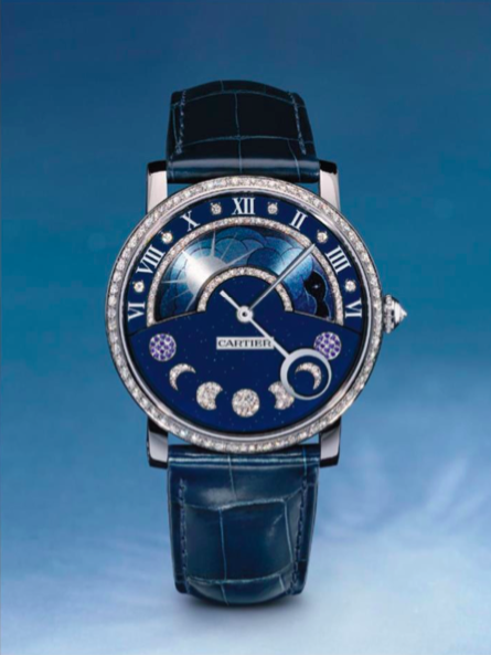 Model Rotonde de Cartier Day/Night Retrograde Moon Phases propůjčuje svůj velkorysý ciferník dvěma z nejvelkolepějších přídavných zařízení vysokého hodinářství: ukazatel dne a noci a zpětný ukazatel měsíčních fází. Zleva doprava, od východu k západu, Slunce a Měsíc se střídají napříč pohyblivou částí v horní polovině ciferníku. Ve jeho spodní části se pak pohybuje ručička ukazující jednotlivé fáze měsíce. Dvojitá komplikace je zasazená do temně modrého ciferníku potaženého smaltem s jemnými zlatými třpytkami evokujícími hvězdy na obloze. Jednotlivé fáze měsíce jsou osazeny diamanty a safíry. Luneta pouzdra z 18 karátového bílého zlata potaženého rhodiem je po obvodu osázena diamanty.