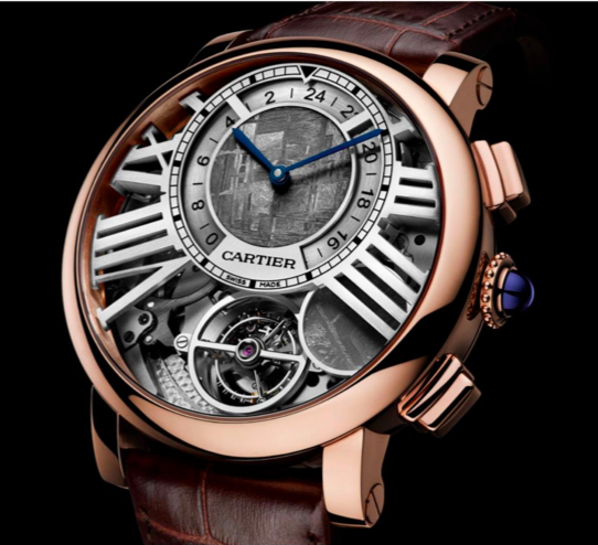 Skrze otevřený číselník a unikátní komplikace, hodinky Rotonde de Cartier Earth and Moon, ve kterých jsou soustředěny nejvyšší technické a estetické charakteristiky domu, navazují na významné tradice vysokého hodinářství značky Cartier. Svůj název hodinky nesou podle subciferníku vyobrazujícího Zeměkouli a Měsíc. Ty jsou ukryty mezi skeletonovými římskými číslicemi v pouzdře z růžového zlata a vyrobeny z leštěného meteoritu, který podtrhuje astrální tématiku modelu. Zobrazení na ciferníku Rotonde de Cartier Earth and Moon je dokonalou souhrou indikací: na jedné straně aktuální místní čas a druhé časové pásmo zobrazené na 24-hodinovém disku, na druhé straně pak lunární zobrazení ve vzájemné závislosti s tourbillonem a indikátorem měsíční fáze. Aktuální měsíční fáze se odhalí po zmáčknutí tlačítka na pozici 4 hodin, které způsobí posunutí disku a zakrytí tourbillonu přesně dle tvaru Měsíce na obloze.