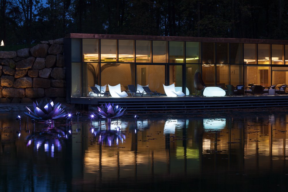 Jak jsem již zmínila, jedná se o nejmodernější komplex, jež je umístěn v podzemí a vyúsťuje k jezírku, kde jsou umístěny sluneční terasy. Wellness centrum je účelně rozděleno na veřejnou část, kde jsou situovány sauny, namátkou zmiňuji solnou saunu, finskou saunu, či bio saunu do 50 stupňů, ale také herbária, inhalační teplária, pára, a v neposlední řadě také dvě odpočívárny s vodními postelemi, které si každý návštěvník může regulovat na svoji zvolenou teplotu. Vše je korunováno úžasnou vířivkou s vyhřívanými lehátky a Kneipovými lázněmi.
