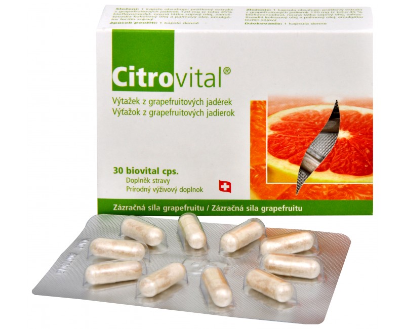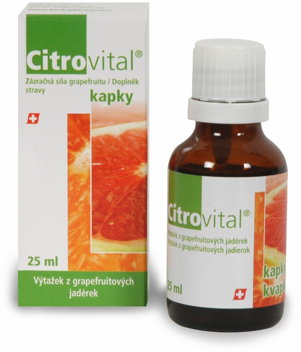 Grepy jsou bohaté na vitamín C, A, B1, B2, B6, kyselinu listovou, hořčík, draslík a fosfor. Díky své hořkosti povzbuzují chuť k jídlu a trávení, enzymy zase látkovou výměnu. Grepová semínka likvidují bacily, jelikož vykazují silné antibiotické účinky. Švýcarská společnost Herb-pharma AG přináší zázračnou sílu grapefruitu v unikátním přípravku Citrovital. Citrovital je velice účinný přípravek obsahující výtažek z grapefruitových jadérek, díky nimž má antioxidační a antimikrobiální účinky. Jeho použití je v období hrozících chřipek optimální. Výtažek z jadérek grapefruitu obsahuje látky zvané bioflavonoidy. U této látky jsou prokázány silné účinky zabraňující množení bakterií, virů a plísní. Tyto přírodní flavonoidy ulehčují trávení, očišťují organismus, posilují odolnost, pomáhají předcházet nachlazení, zlepšují krevní oběh a zvyšují odolnost sliznic. Citrovital přirozeně zvyšuje vitalitu a obranyschopnost organismu. Na výběr máte dvě varianty: Citrovital kapky jsou k dostání v lékárnách za doporučenou cenu 148,- Kč, v balení 25 ml a nebo Citrovital kapsle za doporučenou cenu 181,- Kč, 30 kapslí.