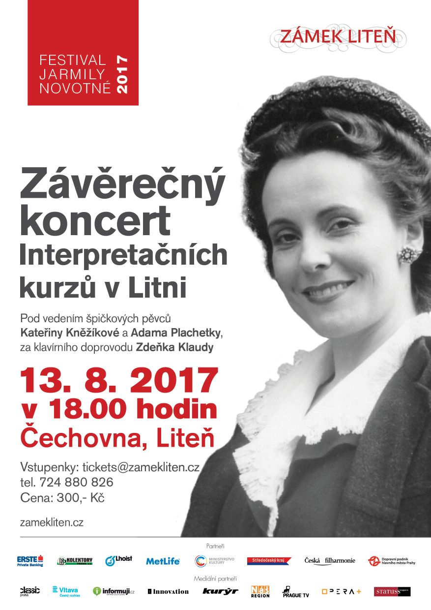 V roce 110. jubilea narození sopránové legendy a světově významné osobnosti Jarmily Novotné, jíž je festival zasvěcen, se vedení pěveckých kurzů ujmou špičková sopranistka a sólistka Národního divadla Kateřina Kněžíková a jeden z našich nejvýznamnějších reprezentantů na mezinárodní scéně, basbarytonista Adam Plachetka. O klavírní doprovod se jako každoročně postará šéfkorepetitor Národního divadla Zdeněk Klauda. Interpretační kurzy v Litni 2017 pořádá ve dnech 9. a 13. srpna nezisková organizace Zámek Liteň, z.s. v rámci 6. ročníku Festivalu Jarmily Novotné. Letošní závěrečný koncert připadá na neděli 13. srpna a jako obvykle se odehraje v sále historického objektu Čechovny.
