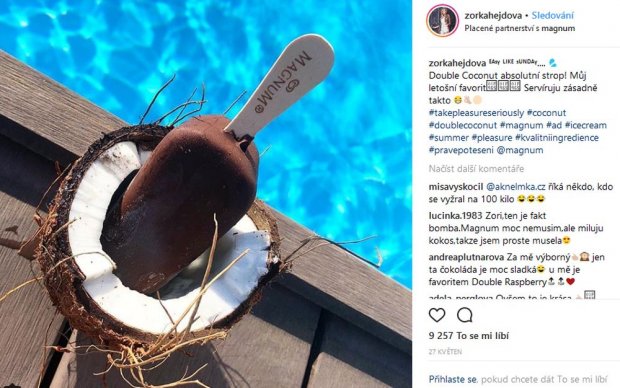 Hejdová je aktuálně tváří zmrzlinových produktů značky Magnum, a jak se svěřila na sociálních sítích, letošním topem je pro ni kokosová varianta. A u svého mlsání se ještě klidně nechá nafotit v bikinách, aby bylo hned každému jasné, že ona si tyhle dobroty klidně může dovolit.